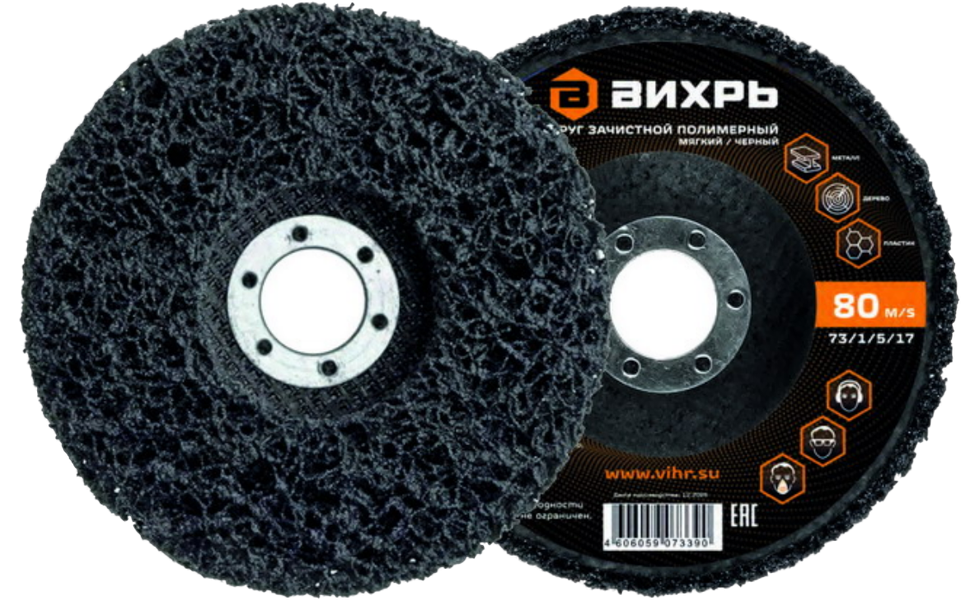 Круг зачистной полимерный 125мм, черный/мягкий (коралловый) Вихрь создан для удаления загрязнений, ржавчины, лакокрасочных покрытий без "среза" основного материала обработки. Коралловый диск эффективно счищает поверхность без повреждений, срезов поверхности, добиваясь идеальной подготовки перед покраской, грунтовкой, сваркой.