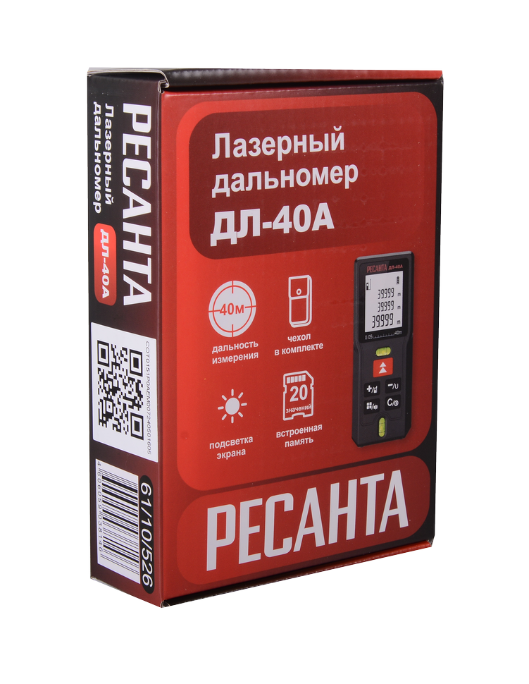 Лазерный дальномер Ресанта ДЛ-40А эффективен при рабочей температуре от 0º до +45º C. В качестве элементов питания используются 2 батарейки типа ААА 1.5V. Индикатор заряда обеспечивает контроль необходимости их замены. Встроенная память позволяет сохранять до 20 значений предыдущих результатов замеров. Доступен выбор единиц измерения: м, мм, см. Подсветка дисплея позволяет использовать прибор при низком освещении. Для удобства хранения предусмотрен тканевый чехол.