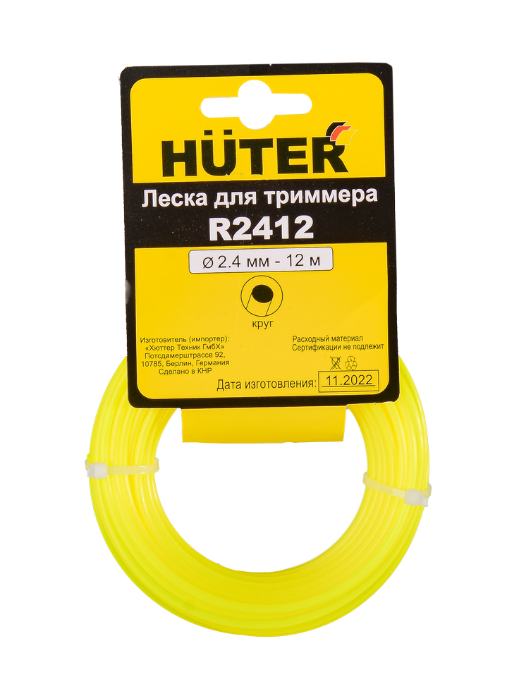 Леска Huter R2412 с круглым сечением диаметром 2,4 мм, длина в мотке 12 м. Универсальная леска для скоса сочной и сухой травы с хорошими характеристиками износостойкости. Чуть хуже круглая леска справляется с молодым кустарником и древесной порослью.