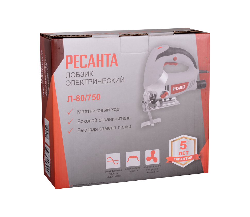 В модели Ресанта Л-80/750 интегрирована производительная функция маятникового хода и предусмотрено регулирование частоты хода штока в пределах 500-3000 ход/мин. Имеется возможность регулирования угла наклона подошвы, что значительно расширяет возможности электрического лобзика. Для удаления с места пиления опилок имеется возможность подсоединения к лобзику пылесоса. В комплектацию вместе с инструментом входят параллельный упор, специальное пильное полотно и ключ-шестигранник. Для подключения инструмента к сети предусмотрен кабель длиной 2 м. Параметры электросети – 220 В, 50 Гц.