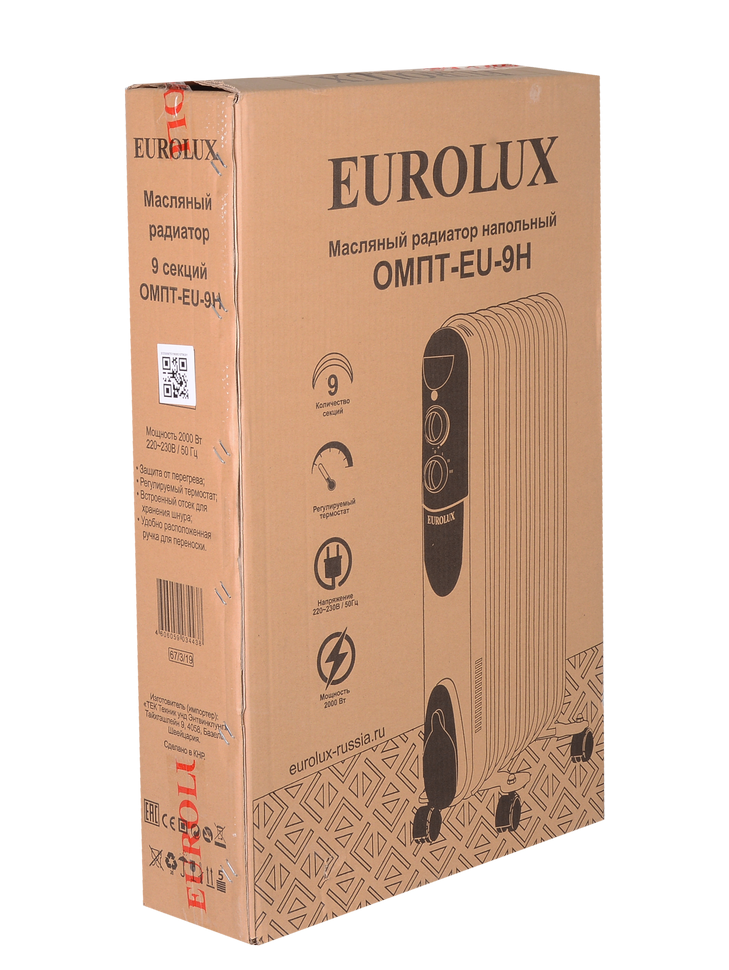 Масляный радиатор Eurolux ОМПТ-EU-9H – это высокоэффективный отопительный прибор. Главная его конструктивная особенность заключается в том, что нагревательный элемент подогревает масло. Благодаря этому, корпус не нагревается до больших температур, поэтому не выжигает кислород и не сушит воздух. Поскольку обогреватель комплектуется нагревательным элементом мощностью 2000 Вт, подходит для помещений площадью до 25 м². Благодаря высокой мощности, прибор позволяет за короткий промежуток времени повысить температуру воздуха до необходимых значений. Масляный радиатор на 9 секций имеет 3 режима работы: 800/1200/2000 Вт. Заданную температуру он поддерживает автоматически за счет встроенного термостата.