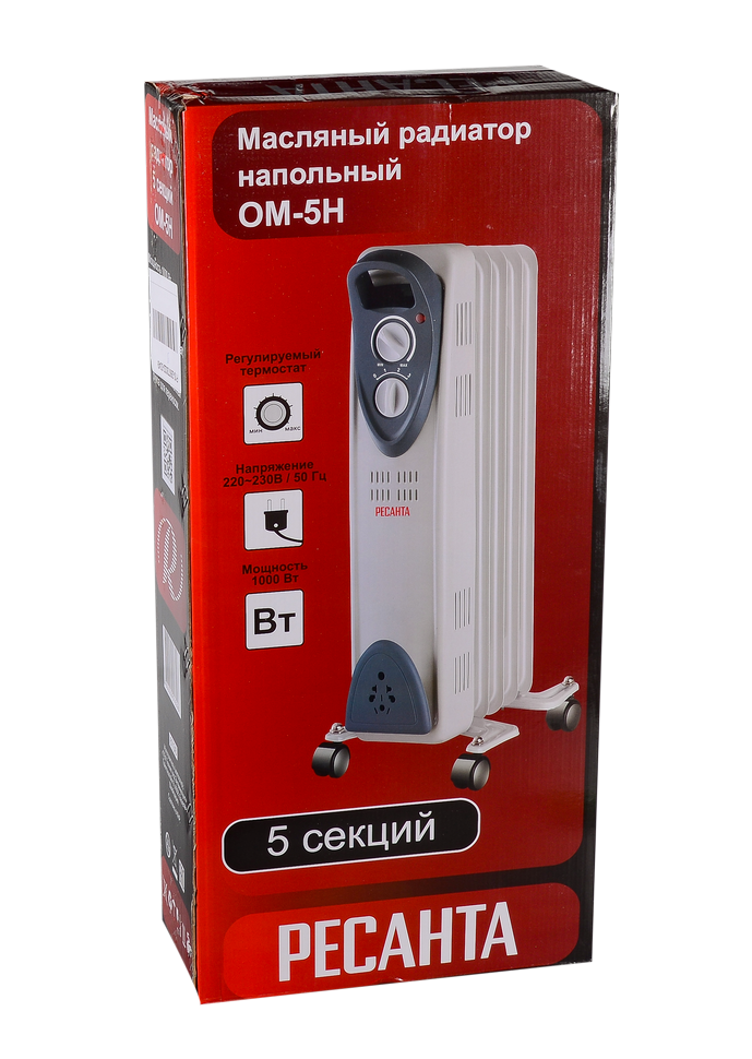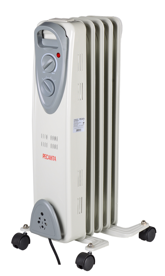 Масляный радиатор Ресанта ОМ-5Н – это высокоэффективный и безопасный в эксплуатации отопительный прибор. Особенность конструкции заключается в том, что внутренняя полость заполнена маслом, которое до заданной температуры подогревает нагревательный элемент. Так как мощность прибора составляет 1кВт, он рассчитан на обогрев помещения площадью до 15 м². Обогреватель комплектуется термостатом, благодаря которому легко поддерживается заданный температурный режим. Работает прибор автоматически, самостоятельно включается и выключается. В масляном радиаторе на 5 секций предусмотрено 3 режима работы (400/600/1000 Вт), поэтому легко выбрать оптимальный вариант.
