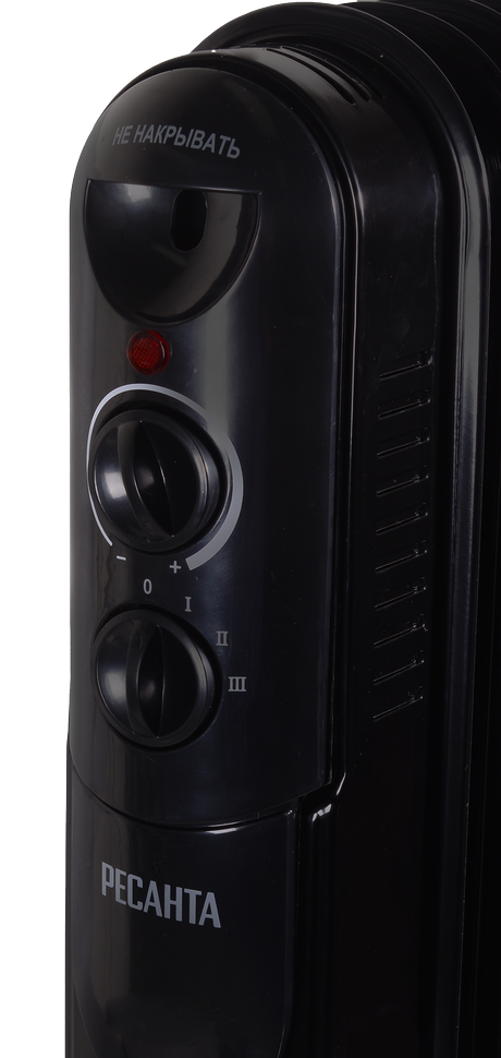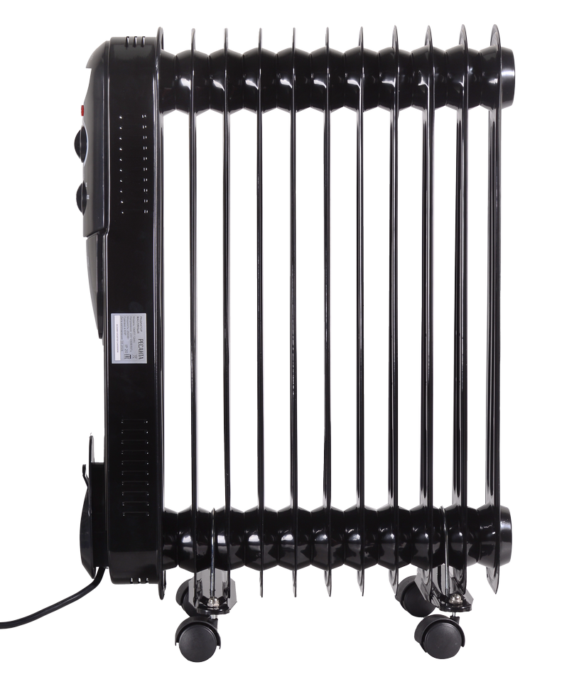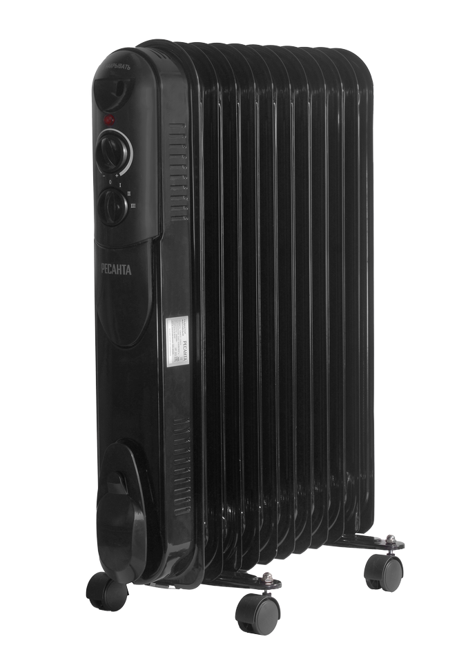 Мощный, надёжный, безопасный масляный радиатор чёрного цвета модели Ресанта ОМПТ-12НЧ предназначен для обогрева помещений площадью до 30 м². Он состоит за 11-ти металлических секций. Внутри прибора залито минеральное масло, нагреваемое ТЭНом, который расположен в нижней части корпуса. Конструкция позволяет быстро выходить на режим нагрева, равномерно распределять тепло и при этом не пересушивать воздух в помещении. Мощность масляного нагревателя составляет 2.5 кВт с возможностью выбора одного из трёх режимов нагрева: 1 – 1000 Вт, 2 – 1500 Вт и 3 – 2500 Вт.