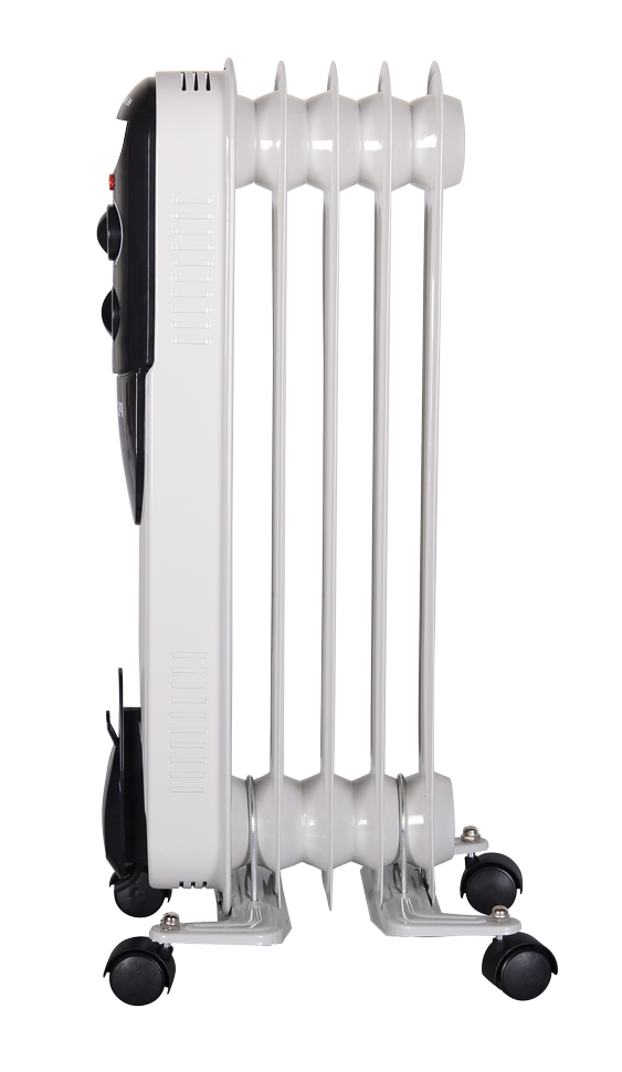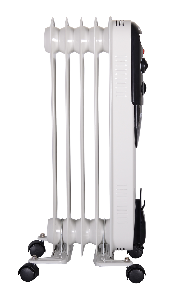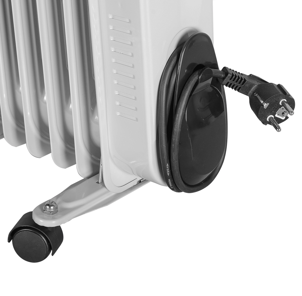 Масляный радиатор удобно перемещать. На корпусе расположена эргономичная ручка. А вес устройства составляет всего 4,3 кг. Радиатор удобно перекатывать с места на место. В нижней части корпуса крепят небольшие колесики, которые существенно облегчают перемещение.