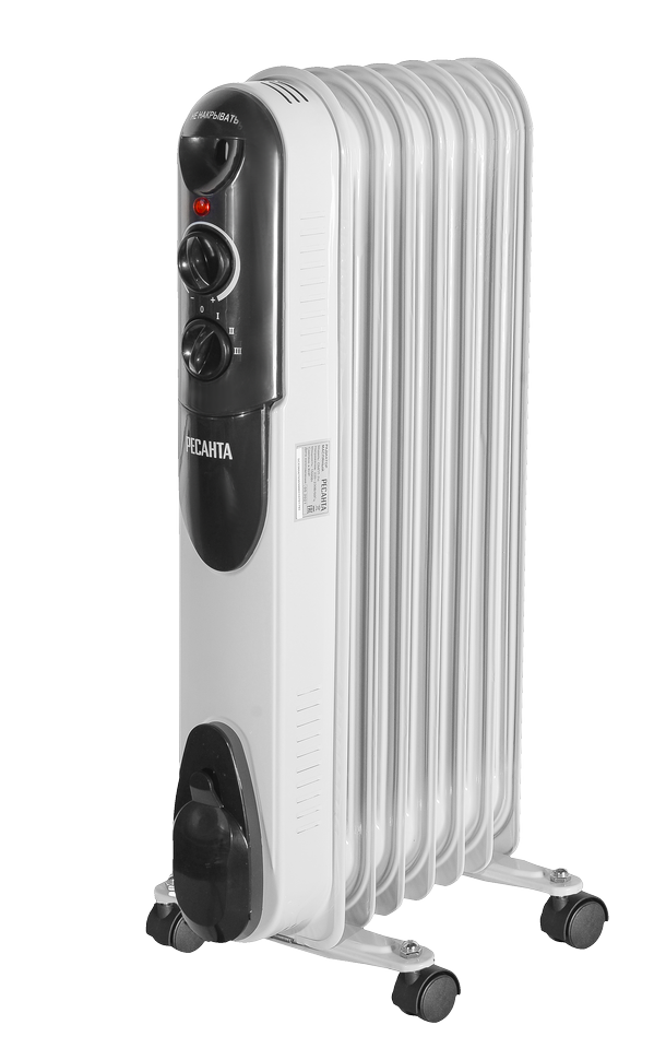 Масляный радиатор РЕСАНТА ОМПТ-7Н – напольный обогреватель для ежедневного многочасового использования для эффективного обогрева помещений до 20 кв.м. Колесики и ручка облегчают перемещение радиатора по дому или офису в течение дня. Нагреватель работает бесшумно и не выжигает кислород.