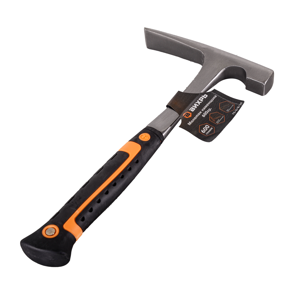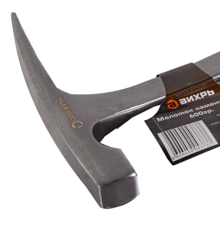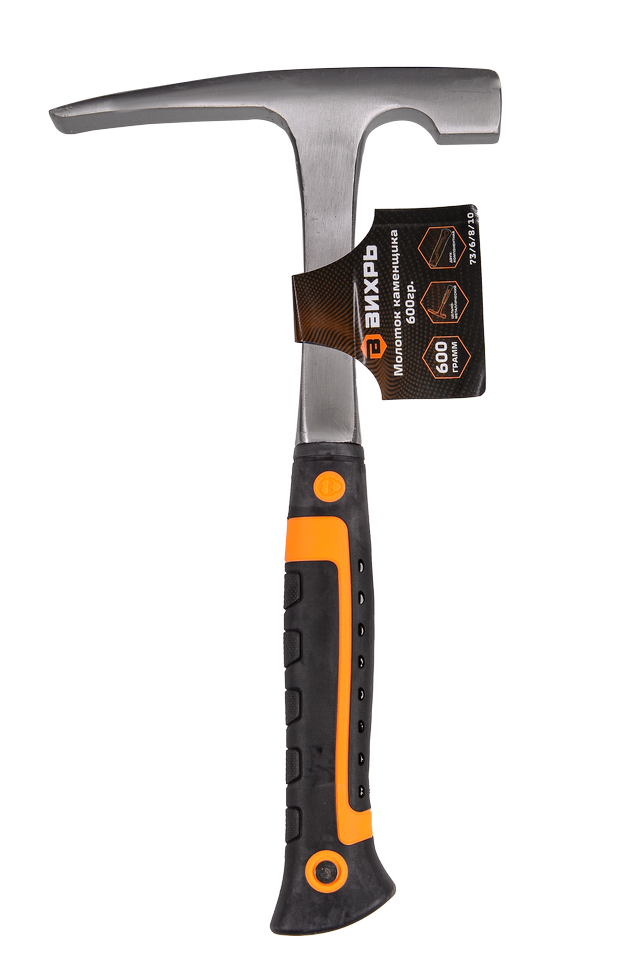 Молоток каменщика Вихрь - это инструмент для рубки и обработки натурального камня, кирпича, бетона, тротуарной плитки. Он состоит из двух частей: двухкомпонентной рукоятки и цельнокованного бойка из закаленной стали. Гладкий квадратный боек имеет специальный заостренный носик с противоположной стороны. Сторона с пикой используется для разрушения камня, а гладкая сторона - для отделки поверхности. Вес бойка - 600 грамм.