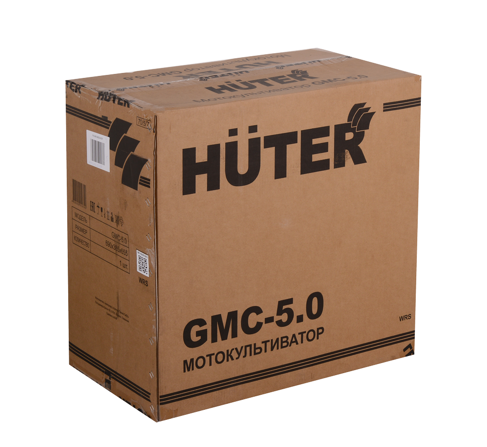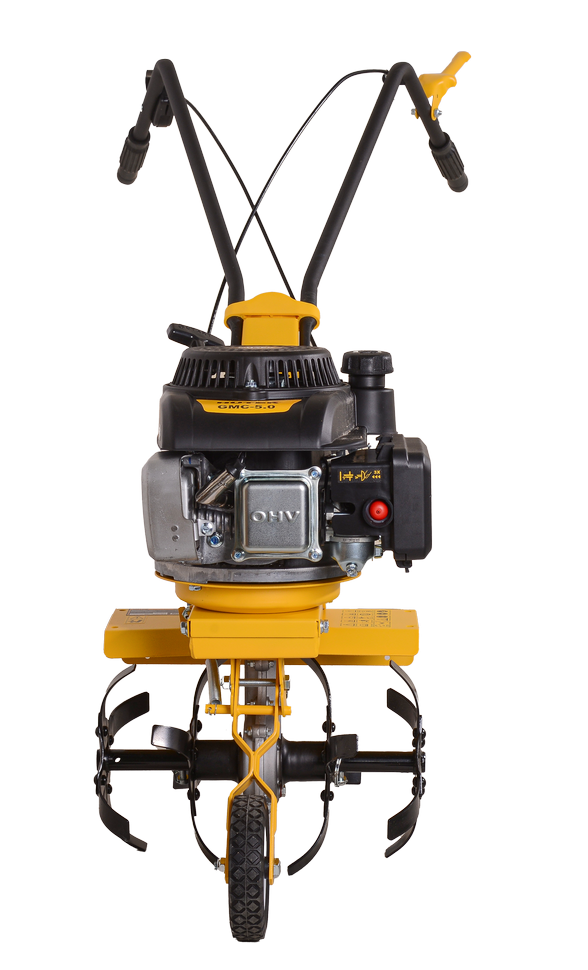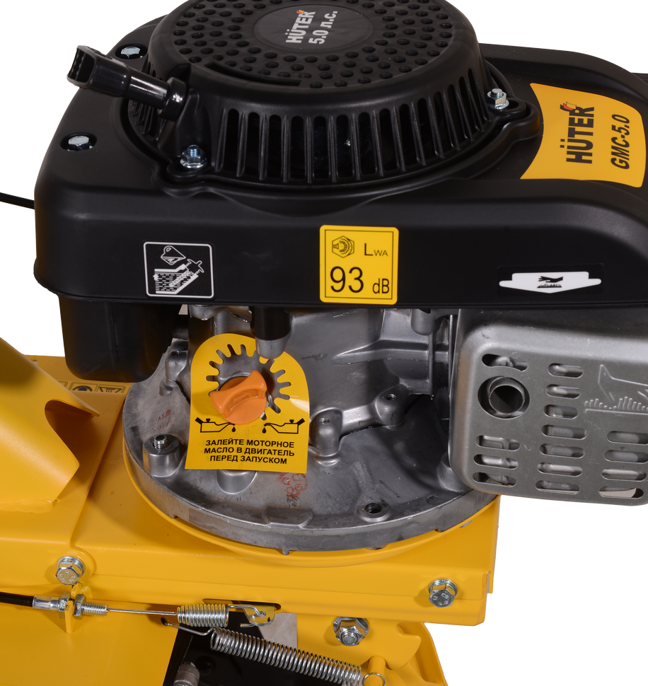 HUTER GMC-5.0 комплектуется четырехтактным одноцилиндровым двигателем мощностью 5 л.с. В топливный бак объемом 2 л допустимо заливать бензин АИ-92. Расход топлива составляет 375 гр/кВт в час, одной заправки бензобака хватает на час непрерывной обработки почвы. Работа двигателя при низком уровне масла или без него недопустима, но производитель защитил мотокультиватор от поломки, установив датчик уровня масла. В картер необходимо заливать масло с вязкостью 10W-40, подходящее для четырехтактных двигателей с воздушным охлаждением.
