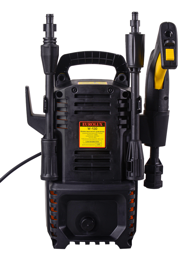 Мойка высокого давления Eurolux W-130 работает от однофазной электросети. Температура используемой воды не должна превышать 50° С. В комплект входит пистолет-распылитель разборного типа, 5-метровый шланг высокого давления и быстросъёмный коннектор для шланга подачи воды. Корпус выполнен из ударопрочного ABS-пластика, что обеспечивает малый вес мойки 5.26 кг. Алюминиевая помпа устойчива к образованию коррозии, отличается длительным сроком эксплуатации. Водозаборный фильтр препятствует попаданию механических примесей. Держатель для кабеля на корпусе защищает его от повреждений при хранении и транспортировке. Кнопка запуска расположена на рукоятке, что позволяет контролировать процесс работы.