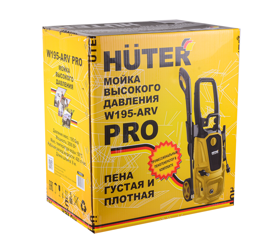 Мойка Huter W195-ARV PRO имеет встроенный фильтр грубой очистки. Препятствуя попаданию примесей в рабочие узлы, фильтрующие элементы продлевают срок их эксплуатации. Корпус помпы и поршни выполнены из металла. Мойка имеет компактные размеры и малый вес 10,71 кг. Наличие колес и удобная рукоятка повышают возможности ее транспортировки. В комплектацию входит штуцер с фильтром, пеногенератор, пистолет-пульверизатор, шланг высокого давления.