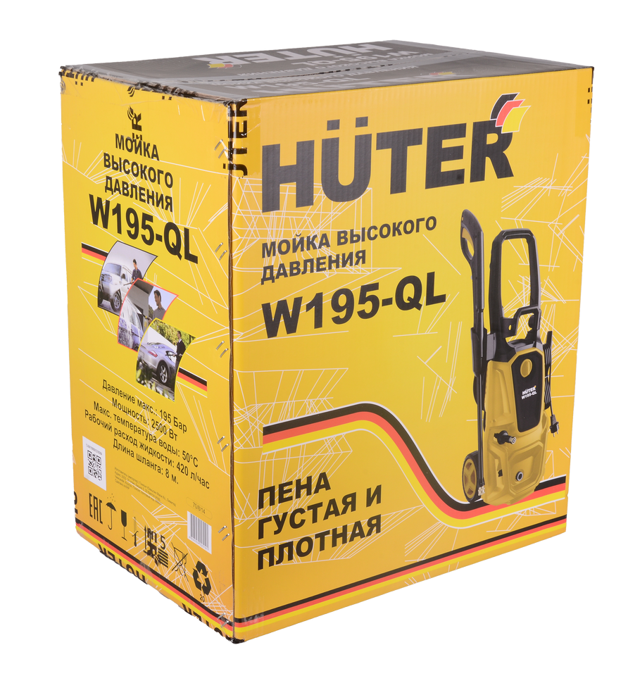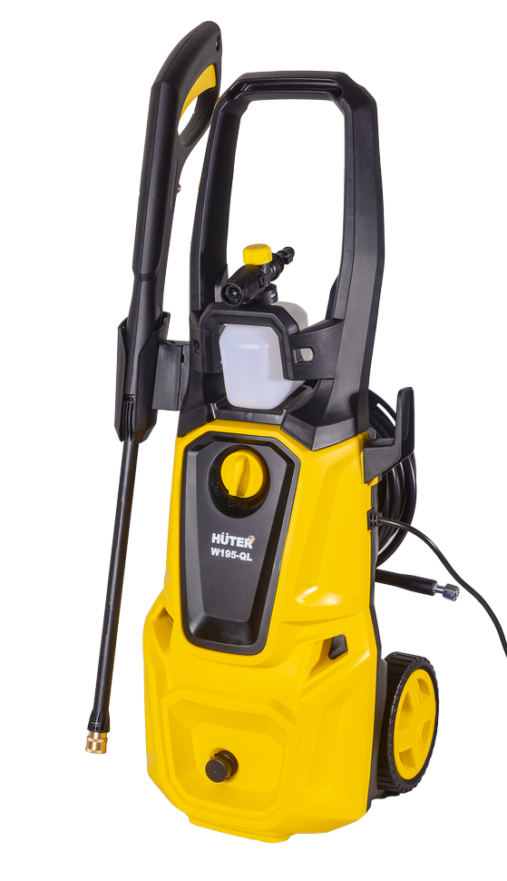 Huter W195-QL работает от электрического синхронного двигателя мощностью 2500 Вт, который обеспечивает высокое максимальное давление 195 бар и превосходное качество мытья.