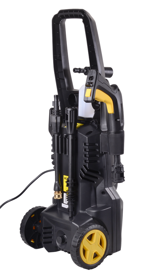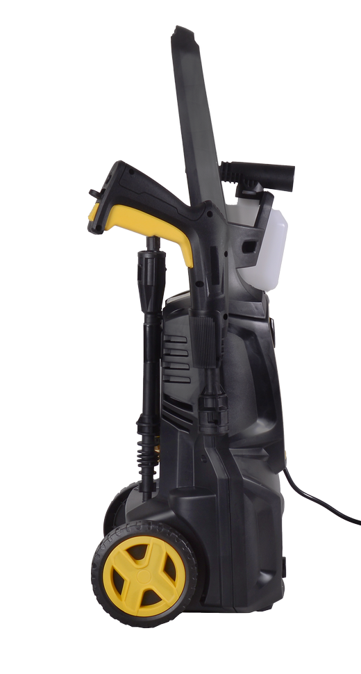 Для удобного перемещения корпус мойки оснащен колесами и пластиковыми ручками. Предусмотрены специальные выступы для удобного хранения шланга, пистолета и пеногенератора.