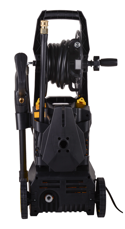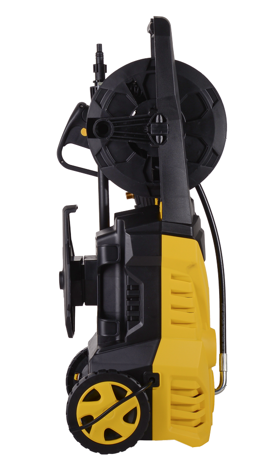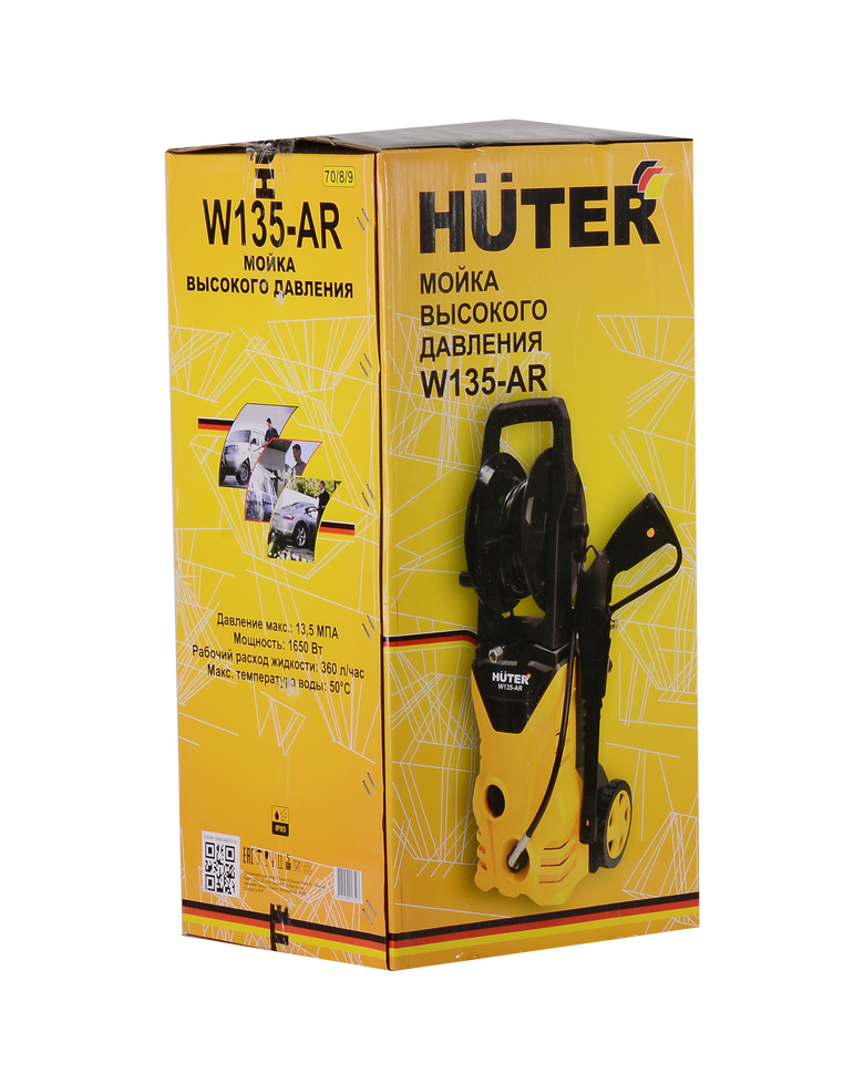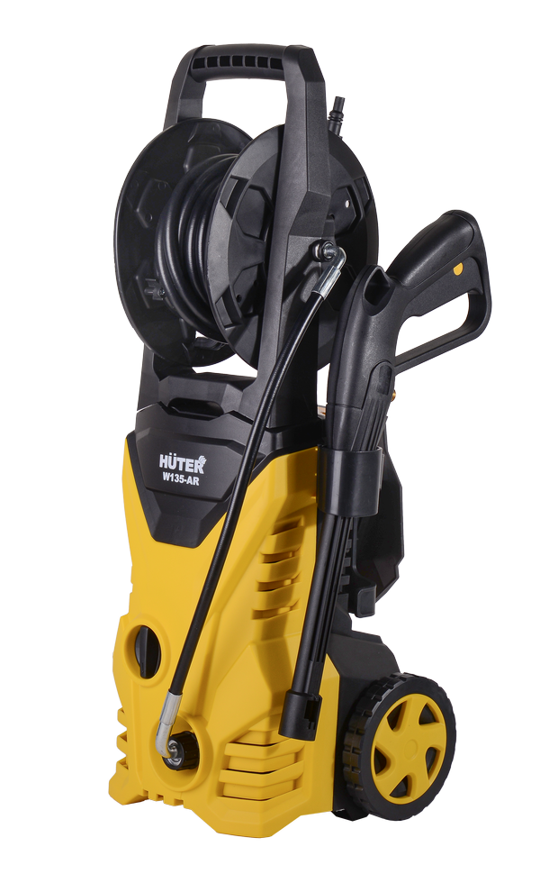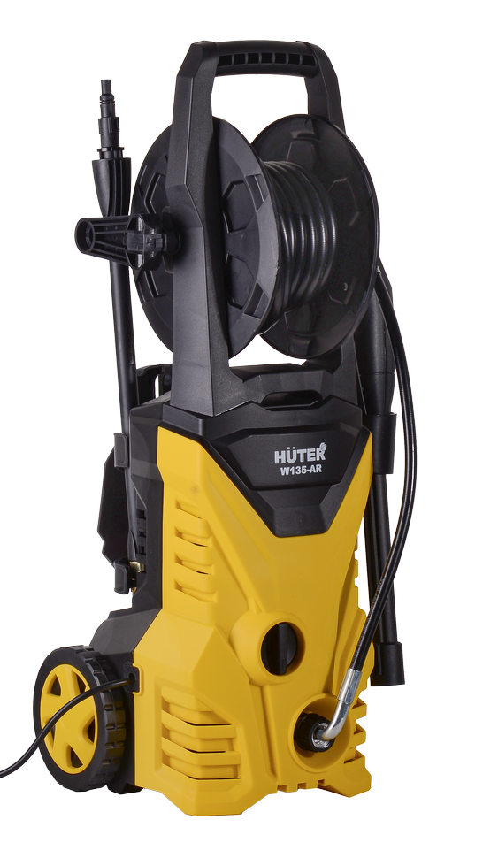 Модель HUTER W135-AR оснащена синхронным двигателем мощностью 1650 Вт, работающем от электросети 220 В. Встроенный пеногенератор (бытовой) позволяет удалять засохшую грязь в щадящем режиме. Шланг высокого давления длиной 5 м сделан из поливинилхлорида, устойчивого к растрескиванию при низких температурах. Для комфортного хранения шланг сматывается на барабан под ручкой.