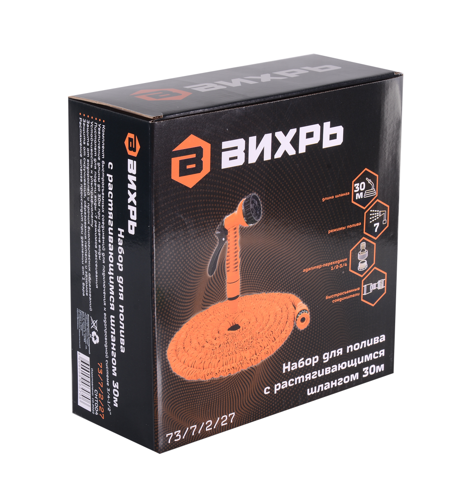 Набор для полива с растягивающимся шлангом 30м Вихрь состоит из растягивающегося латексного шланга длиной 30 метров, насадок для полива и крепления.