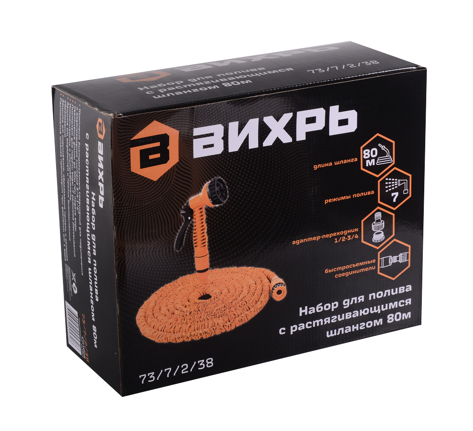 Набор для полива с растягивающимся шлангом 80м Вихрь состоит из растягивающегося латексного шланга длиной 80 метров, насадок для полива и крепления.