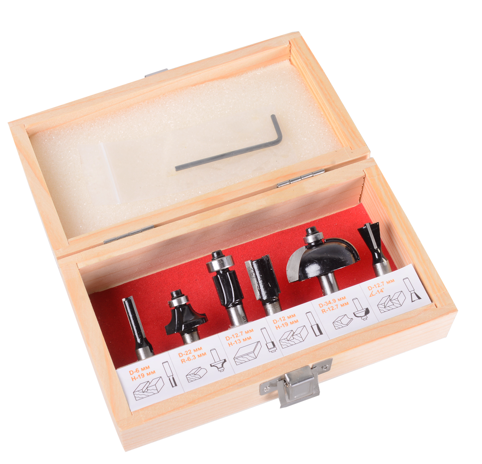 Набор фрез по дереву 6шт (хвостовик 8мм) в кейсе состоит из шести различных фрез с хвостовиком диаметром 8 мм, которые позволяют выполнять различные виды работ с фрезерными станками и ручными фрезерами.