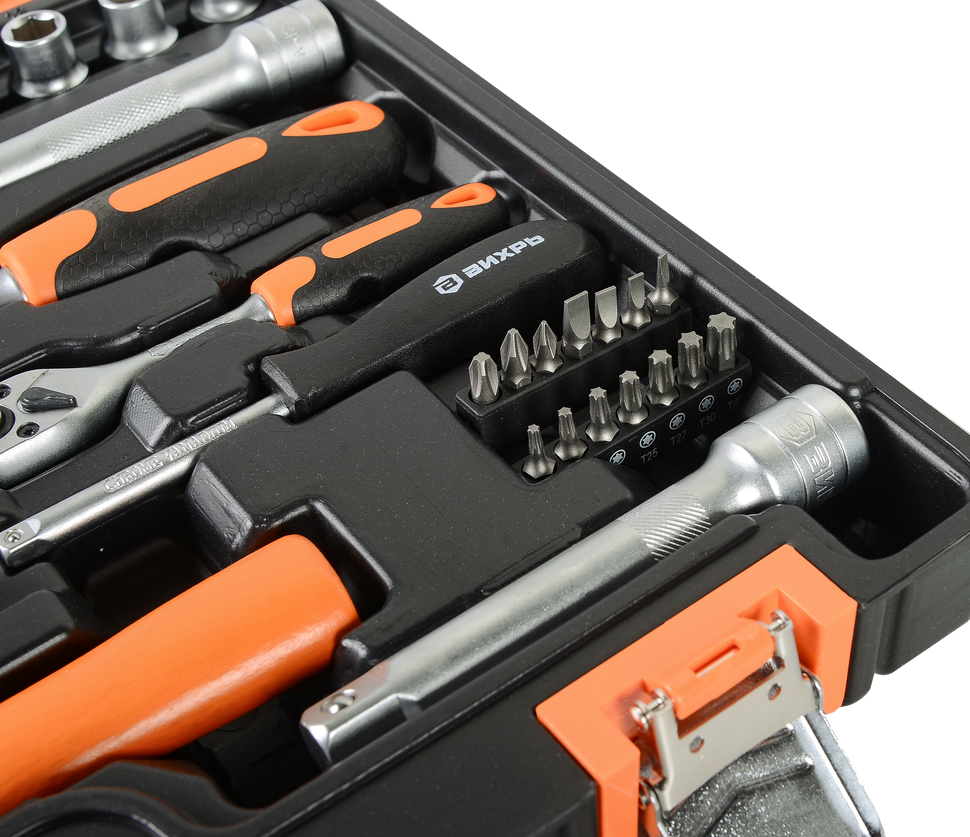 Каждый предмет из набора инструментов, 1/2", 1/4", CrV, пластиковый кейс 76 предмета Вихрь промаркирован, а все ложементы подписаны. Кейс можно положить в багажник машины и возить с собой: он морозостоек, выдерживает случайные удары и туго закрывается с помощью металлических замков.
