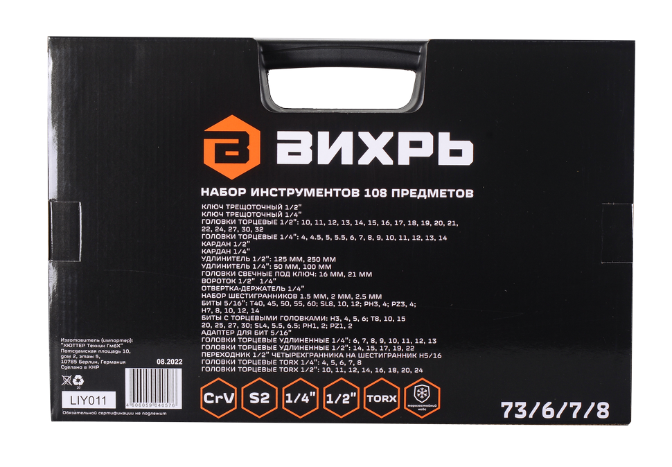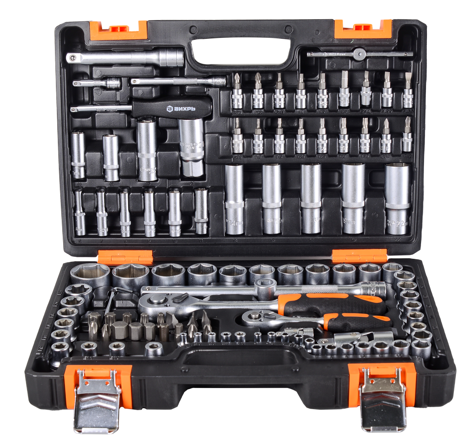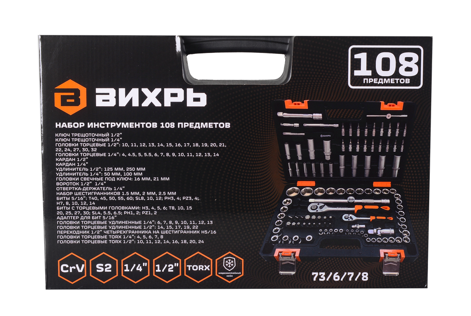 Удобный многофункциональный набор инструментов, 1/2", 1/4", CrV, в кейсе 108 предметов Вихрь станет оптимальным выбором для профессионалов и любителей, занимающихся ремонтом техники.