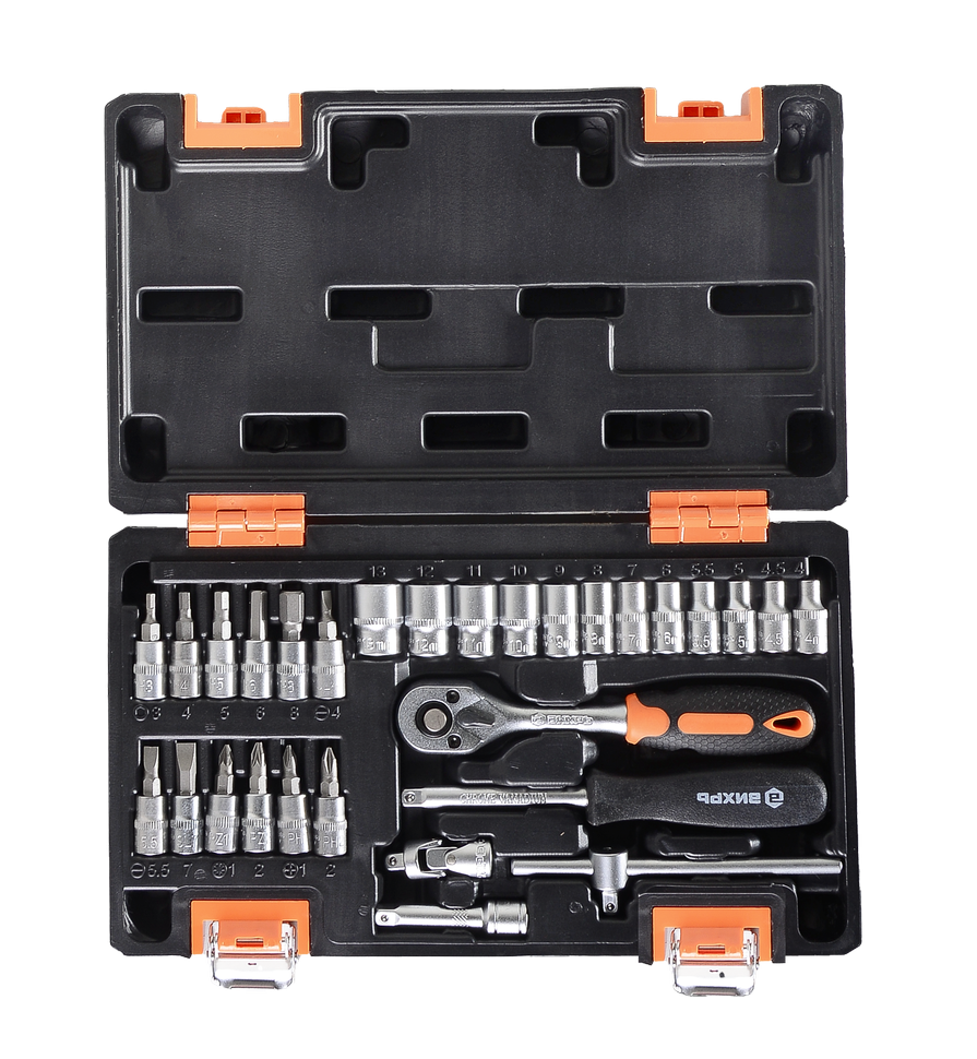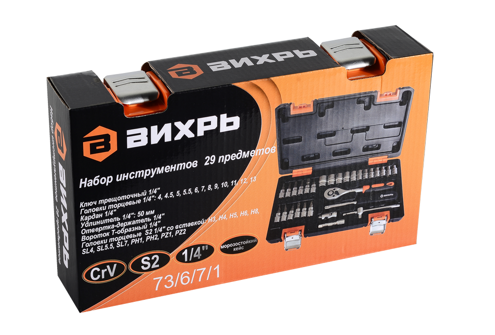Набор инструментов, 1/4", CrV, пластиковый кейс, 29 предметов содержит все необходимое для ремонта автомашины, мотоцикла, садовой или иной техники.