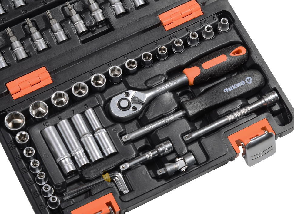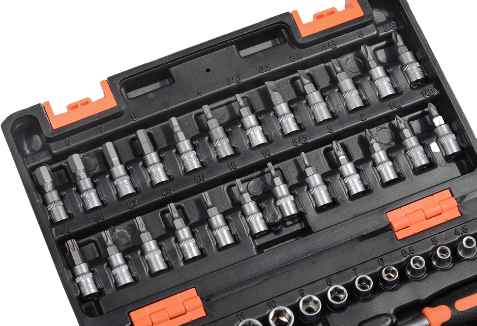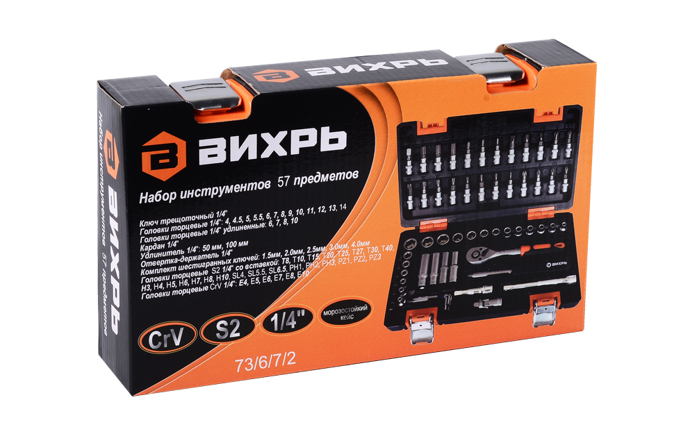 Набор инструментов Вихрь 1/4" CrV пластиковый кейс включает в себя 57 самых необходимых и часто используемых элементов, - и ничего лишнего.