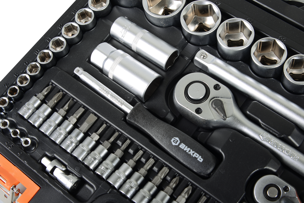 Набор инструментов АВТО, 1/2" , 1/4" , CrV, в кейсе 82 предмета Вихрь подойдет для применения как в автомастерской, так и в быту. С помощью входящих в комплект инструментов можно починить автомобиль, велосипед, другую технику, в том числе и садовую.