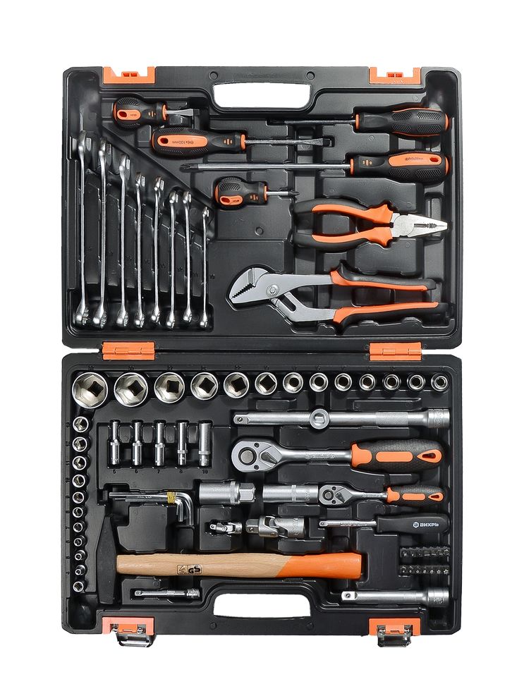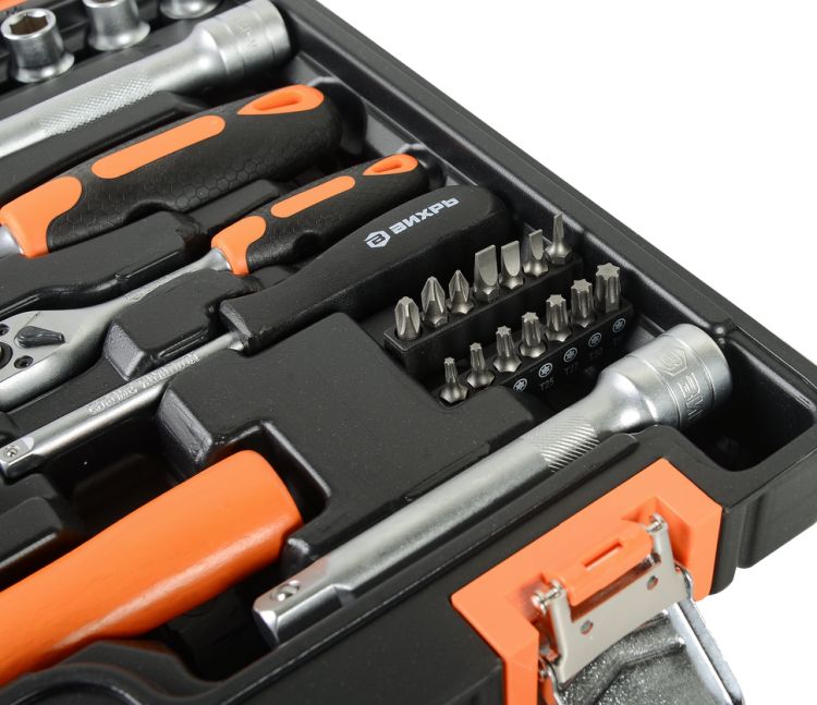 Набор инструмента ВИХРЬ предназначен для ремонта автомобилей, мотоциклов, садовой и другой техники. Подходит как для использования на станциях технического обслуживания, так и в бытовом применении дома или на даче. Инструмент изготовлен в соответствии с международными стандартами. Головки и комбинированные ключи изготовлены из хромованадиевой стали, придающей инструменту высокую твердость и легкость. Биты, биты-вставки и отвёртки производятся из стали S2, улучшающей характеристики крутящего момента и твёрдости. Все наборы упакованы в кейс, изготовленный из жесткого противоударного пластика, с металлическими застёжками.