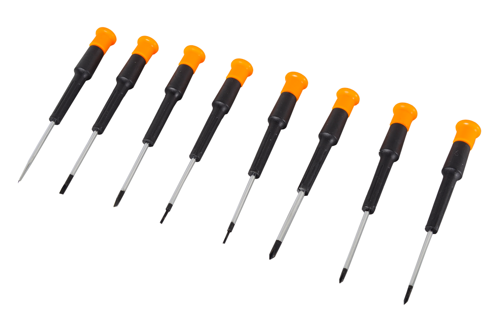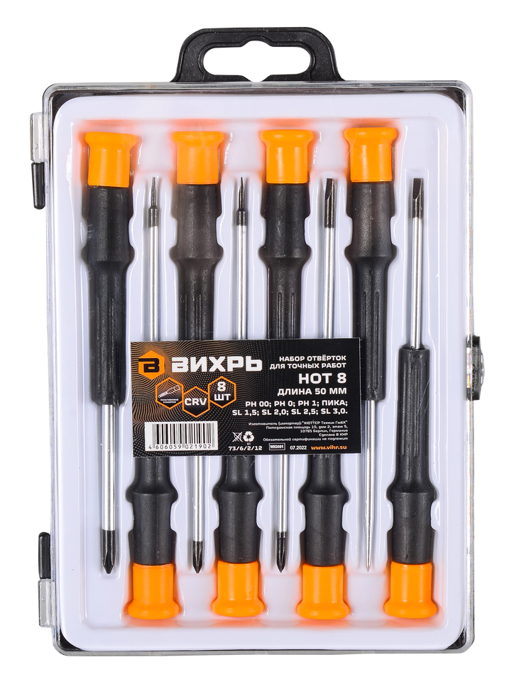 В комплекте набора отвёрток для точных работ НОТ 8 представлено 8 отвёрток с различными размерами и типами лезвий, специально разработанных для работы с мелкими деталями.