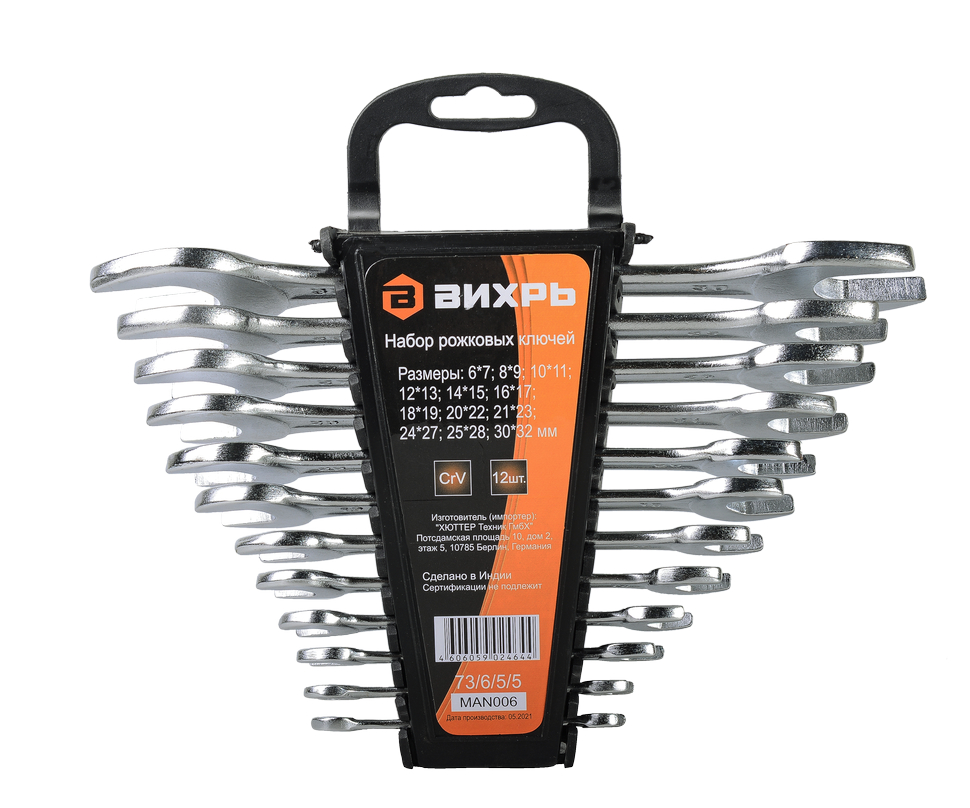 Набор накидных ключей Вихрь состоит из 12 штук с размерами от 6 до 32 мм: