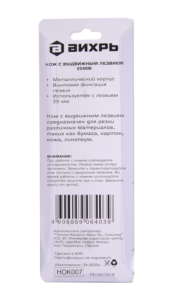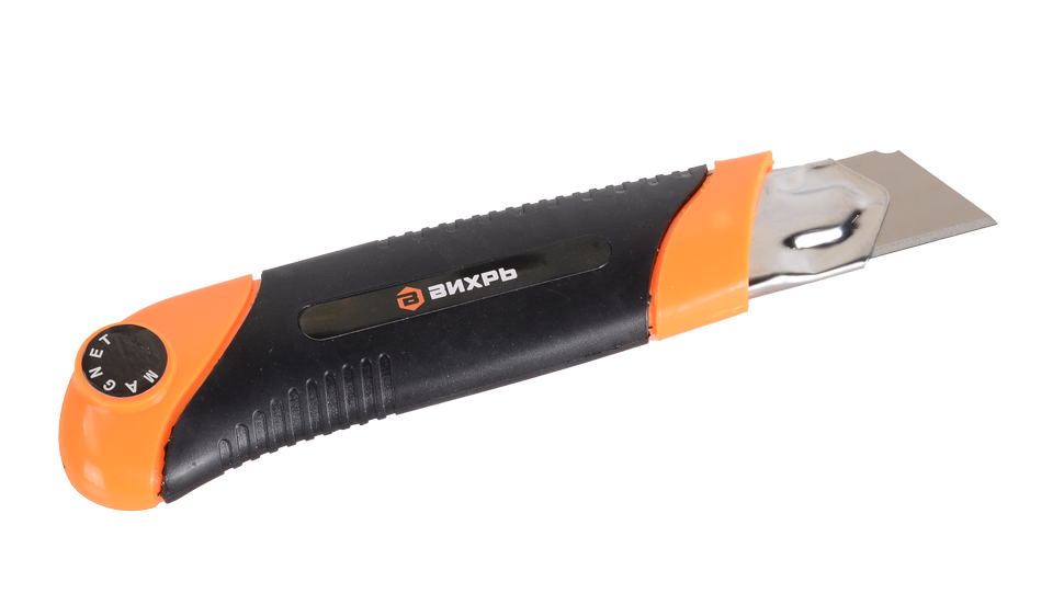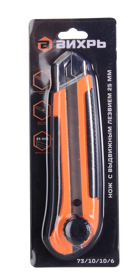 Нож с выдвижным лезвием 25 мм, двухкомпонентный корпус, винтовой фиксатор, Вихрь предназначен для резки различных материалов в бытовых, хозяйственных или строительных целях.