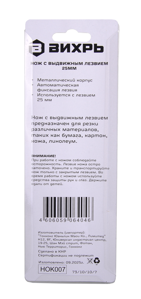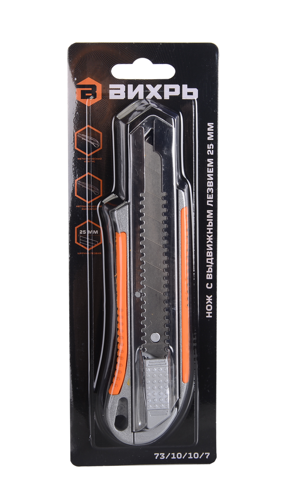 Нож с выдвижным лезвием 25 мм, металлический корпус, автоматический фиксатор, Вихрь предназначен для резки различных материалов в бытовых, хозяйственных или строительных целях.