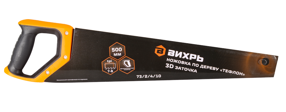 Ножовка Вихрь 500 мм "Тефлон" 3D заточка - это ручной инструмент для пиления древесины и других материалов. Длина ножовки 500 мм, шаг зуба 7-8 TPI. Ножовка изготовлена из углеродистой стали с твердостью закаленного зуба 46–52 HRС. Зубья имеют трехгранную (3D) заточку. Эта технология позволяет значительно увеличить скорость резки и уменьшить нагрузку на руки.