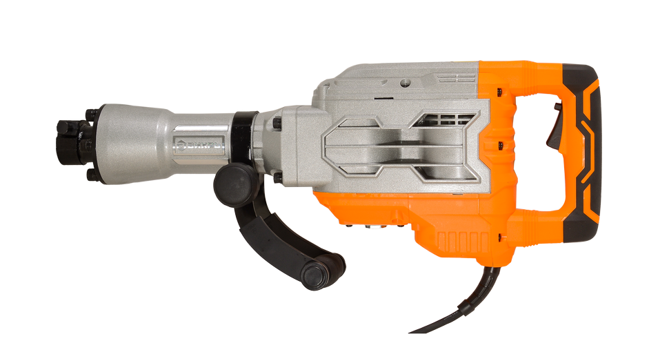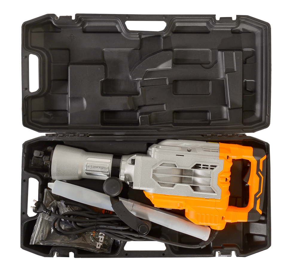 Устройство работает от однофазной сети и оснащено прочным кабелем длиной 4 м. Мощности двигателя 1750 Вт достаточно для обеспечения ударной энергии 65 Дж. Рабочий механизм расположен в ударопрочном металлическом корпусе. Дополнительную рукоятку можно перемещать и устанавливать в удобном для оператора положении, для этого не требуется привлечение дополнительного инструмента. Патрон для крепления насадок представляет собой шестигранник размером 30 мм. Такая система делает процесс замены оснастки более быстрым и удобным. Зубило, пика и тюбик со смазкой прилагается в комплекте. На корпусе имеется смотровое окошко для отслеживания уровня смазки, а также блокировка кнопки включения, благодаря чему нет необходимости удерживать клавишу нажатой в течение всего процесса эксплуатации отбойного молотка. Звуковое давление агрегата составляет 92 дБ. Инструмент весит 22,53 кг, однако наличие кейса с 2 колесами существенно облегчает его перемещение.