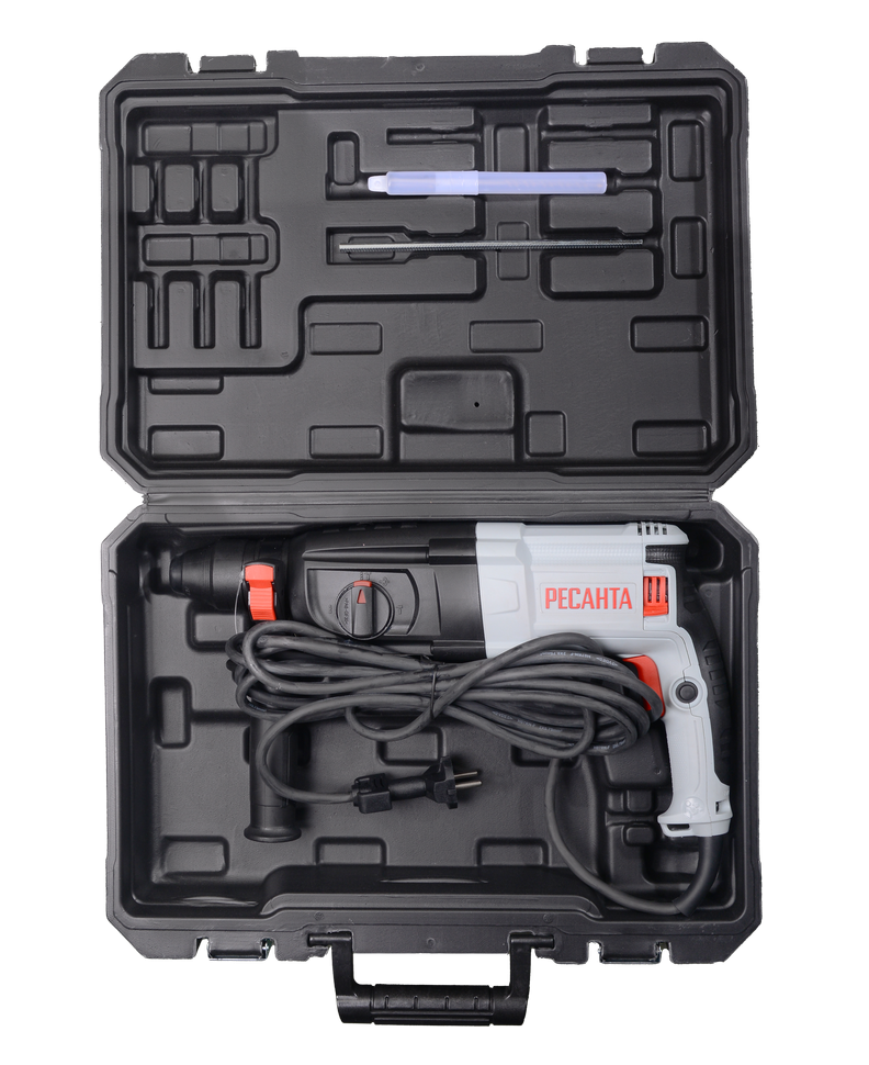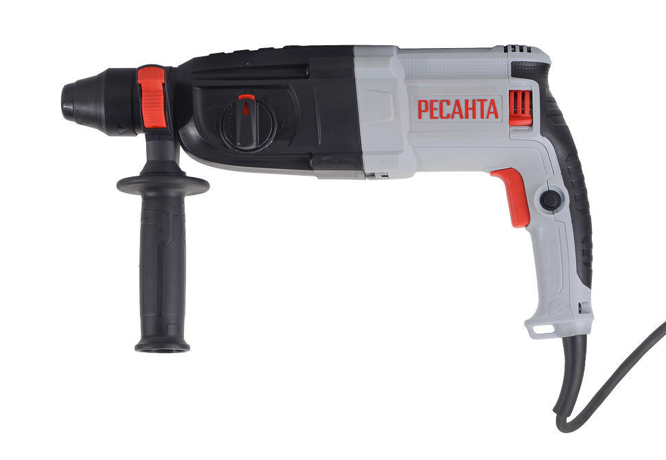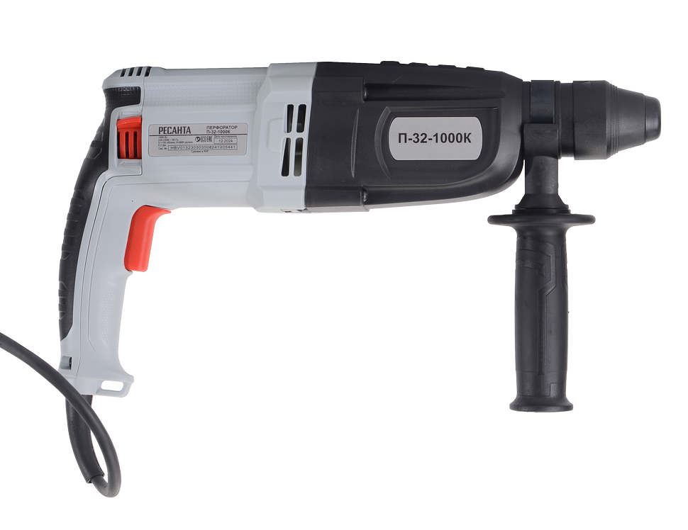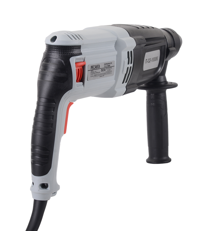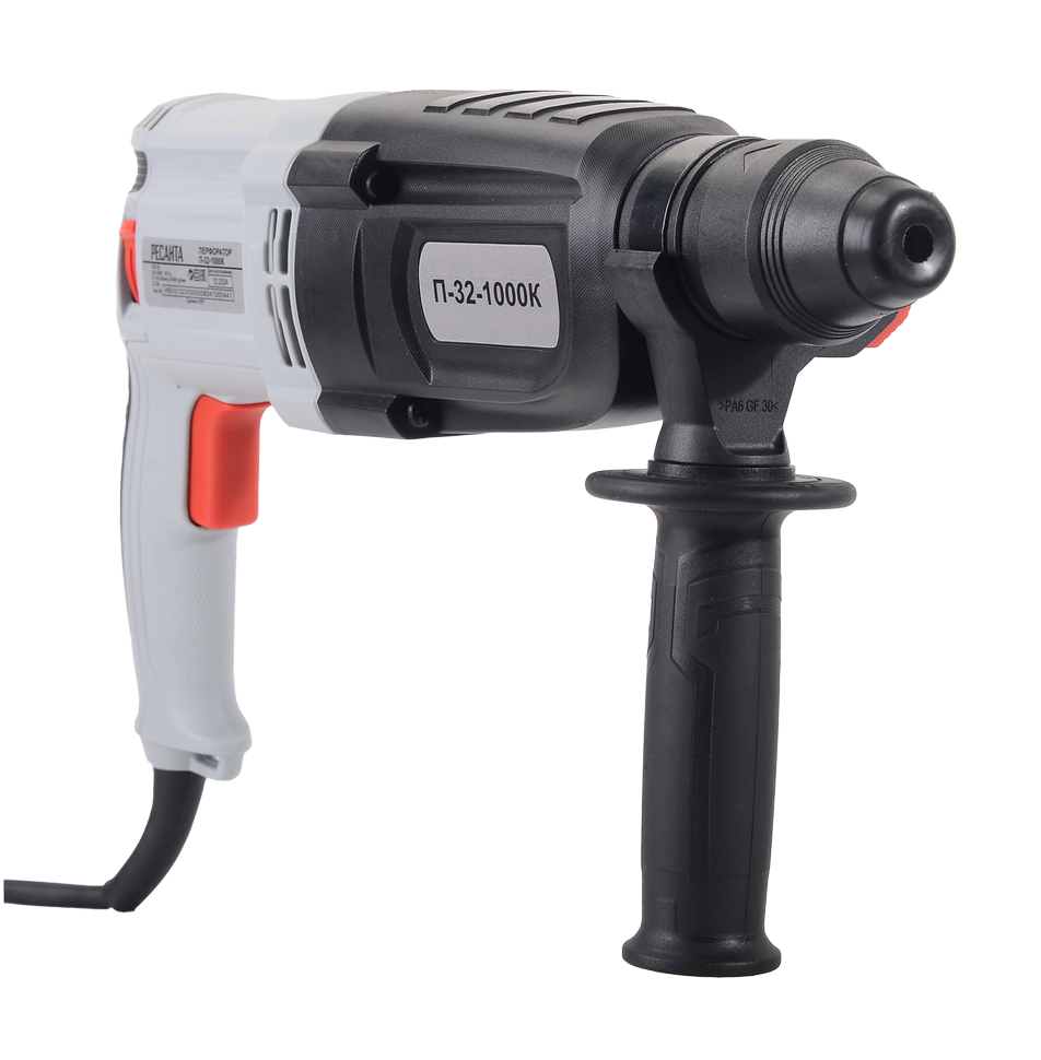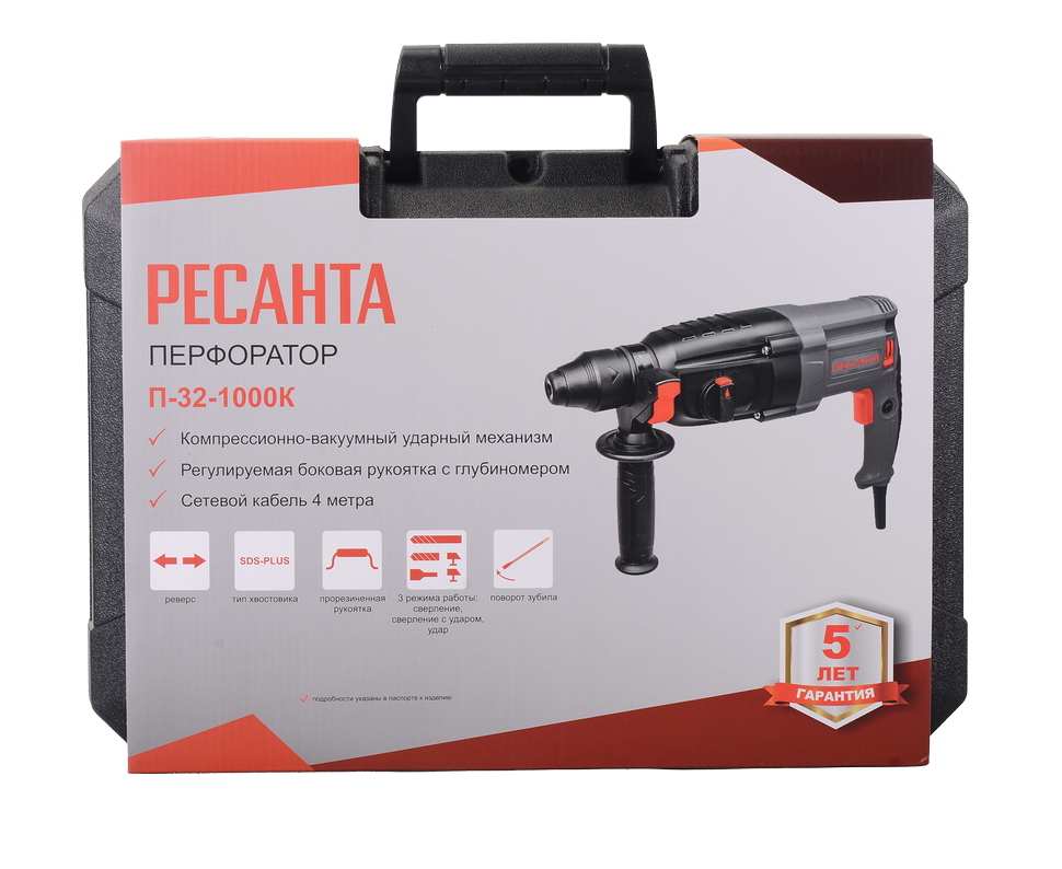 Перфоратор модели Ресанта П-32-1000К оснащён электродвигателем мощностью 1000 Вт, имеет 3 режима работы: режим сверления, режим сверления с ударом, режим удара. Энергия удара составляет 5,2 Дж. Частота вращения регулируемая и составляет от 0 до 1100 об/мин. Частота ударов – 0-4900 уд/мин. Максимальный диаметр сверления в древесине – до 40 мм, в бетоне – до 32 мм, в стали – до 13 мм. Блокировка кнопки включения исключает случайный запуск электродвигателя. Имеется возможность регулировки углового положения перфоратора. Устройство оснащено кабелем 2-метровой длины и дополнительной ручкой с резиновым покрытием. Питание инструмента – от сети 220В, 50Гц. Вес – 3.4 кг.