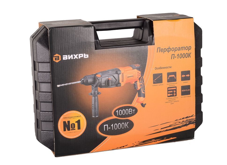Перфоратор Вихрь П-1000К имеет щеточный двигатель, расположенный горизонтально. Это позволяет равномерно распределить вес инструмента, который составляет 3,4 кг. Блокировка кнопки включения предотвращает случайный запуск инструмента. Ее фиксация в нажатом положении полезна в процессе длительной работы. Для удобного хранения инструмента и оснастки предусмотрен прочный пластиковый кейс.