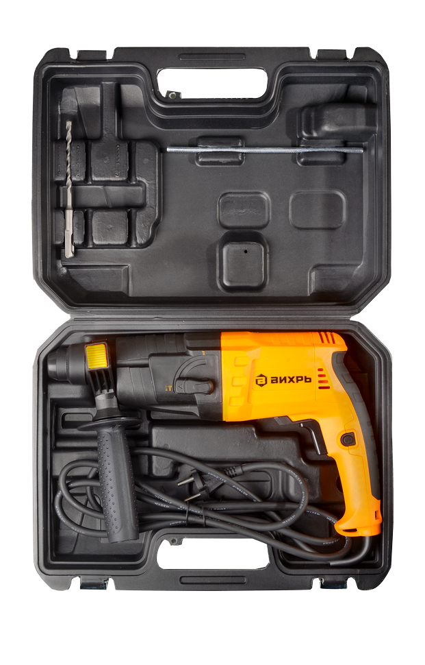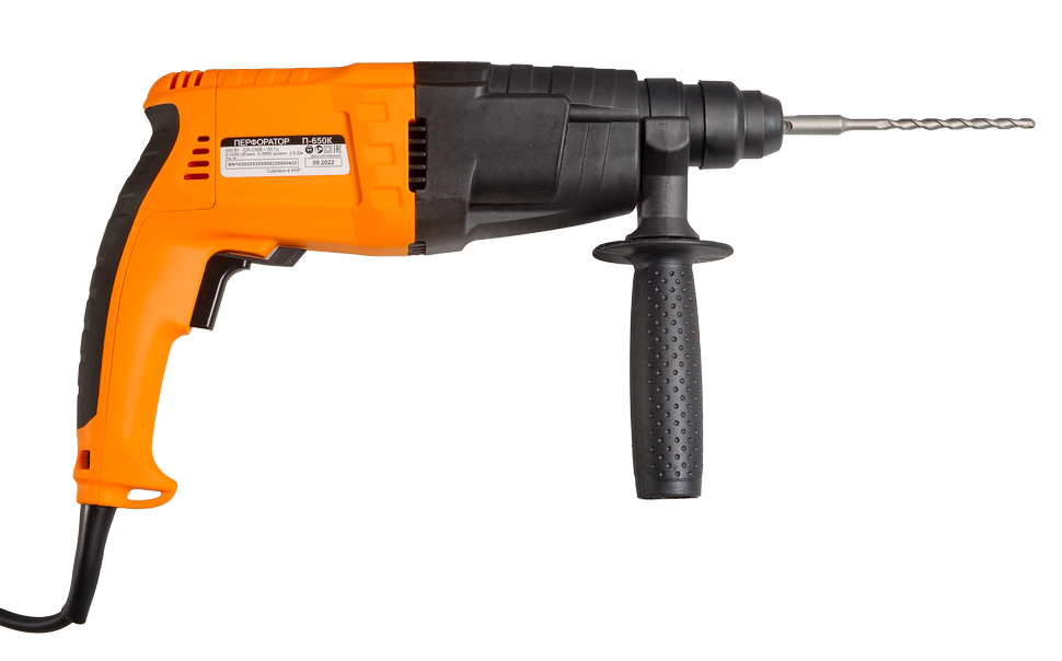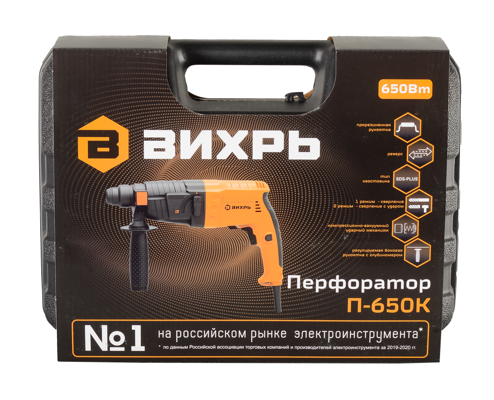 Базовая модель перфоратора Вихрь П-650К предназначена для бытового использования. Этот инструмент рассчитан на сверление и пробивание отверстий в твёрдых материалах, таких как бетонные поверхности – диаметр отверстий – до 24 мм, древесина – до 30 мм, сталь – до 13 мм. Перфоратор оснащён надёжным электродвигателем мощностью 650 Вт, ударным механизмом, обеспечивающим удар с энергией 2.6 Дж и патроном SDS-PLUS для быстрой смены и зажима рабочей оснастки. Частота вращения может регулироваться и составляет от 0-1000 об/мин.