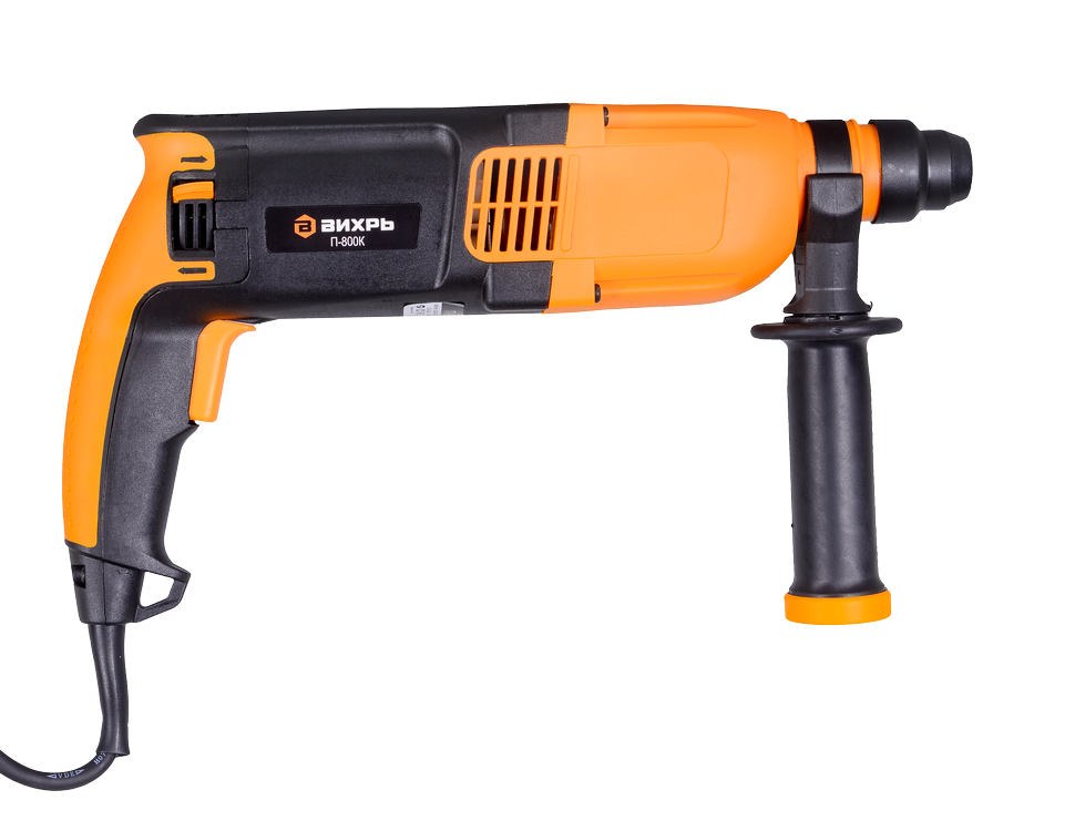 Перфоратор Вихрь П-800К оснащён электрическим двигателем, мощность которого составляет 800Вт, а также пневматическим ударным механизмом, который обеспечивает удар 3.2 Дж. Функционирование возможно в режимах обычного сверления, с ударом, режим удара.