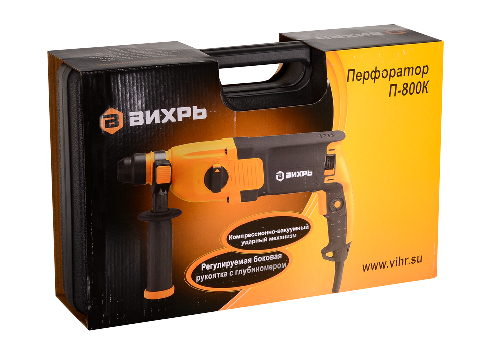 Для повышения эффективности и простоты эксплуатации в модели Вихрь П-800К имеется системы настройки углового положения и регулирования частоты вращения от 0 до 1100 об/мин, а также патрон для быстрой замены рабочей оснастки, реверс и специальная муфта для отключения перфоратора при его заклинивании. Есть также блокировка кнопки пуска, что облегчает работу с инструментом во время длительных сессий. Перфоратор рассчитан на сверление бетона, стали, дерева с максимальным диаметром 28, 13, 40 мм соответственно и снабжён регулируемым ограничителем глубины сверления. Инструмент питается от сети 200 В, 50 Гц. Вес – 2.7 кг. Для хранения и переноски предусмотрен удобный кейс.