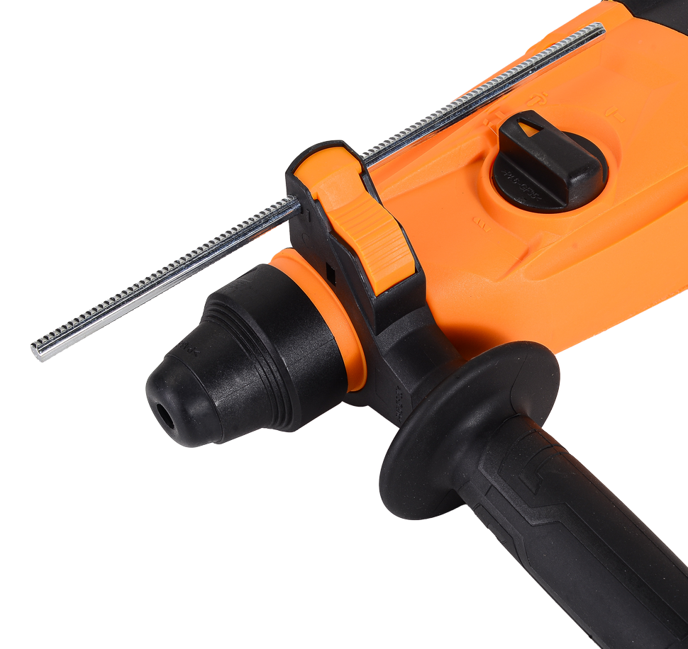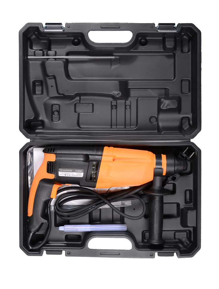 Электрический перфоратор Вихрь П-900К обладает мощностью 900 Вт. Это дает возможность работать в трех режимах: сверление, сверление с ударом и режим удара. Максимальная скорость вращения составляет 1100 об/мин. Ее регулировка позволяет настраивать интенсивность работы в зависимости от плотности материала. Наибольший диаметр сверления для древесины составляет 40 мм, для металла - 13 мм, для бетона - 30 мм. Частота ударов равна 5200 уд/мин, что обеспечивает высокую производительность. Энергия удара 4 Дж позволяет выдерживать сложные и продолжительные виды работ. Тип хвостовика SDS-PLUS предназначен для быстрой замены оснастки.