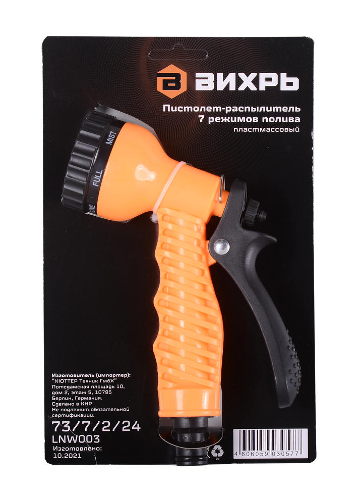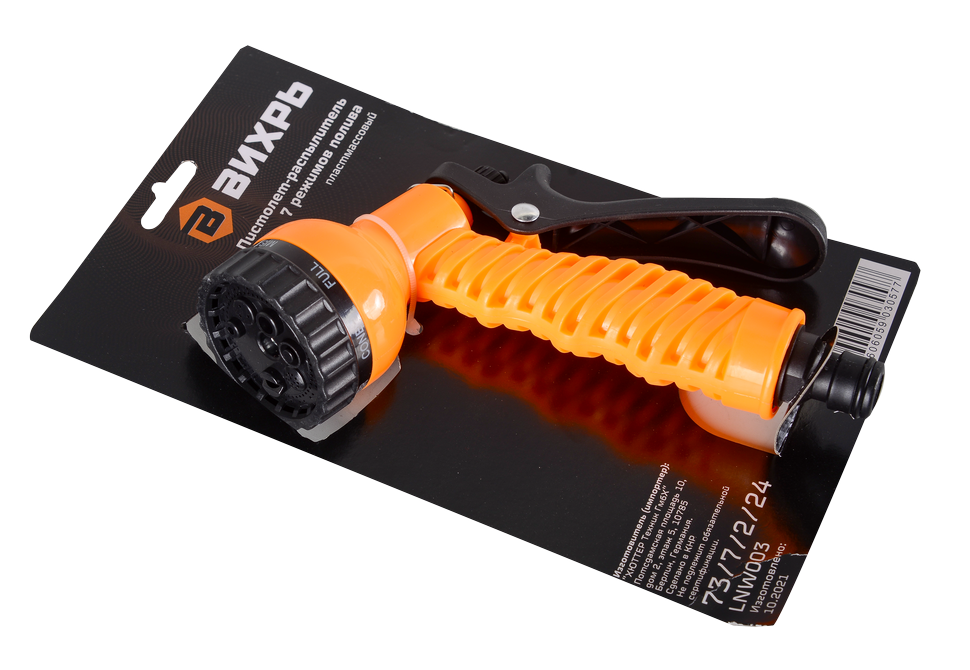 Пистолет-распылитель Вихрь позволяет регулировать интенсивность и характер полива растений на даче, в саду или на газоне. Он имеет 7 режимов полива, каждый из которых обеспечивает определенный вид полива: