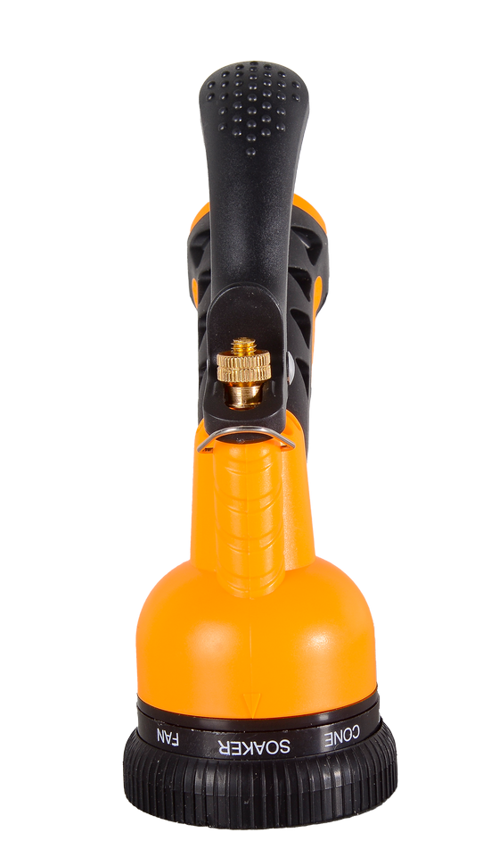 Распылитель выполнен из пластика и легко подключается к шлангу. Он имеет эргономичную металлическую рукоятку, которая служит для регулировки напора воды, что позволяет контролировать интенсивность полива. Это особенно важно при работе с молодыми растениями, которые не выдерживают сильного напора воды.