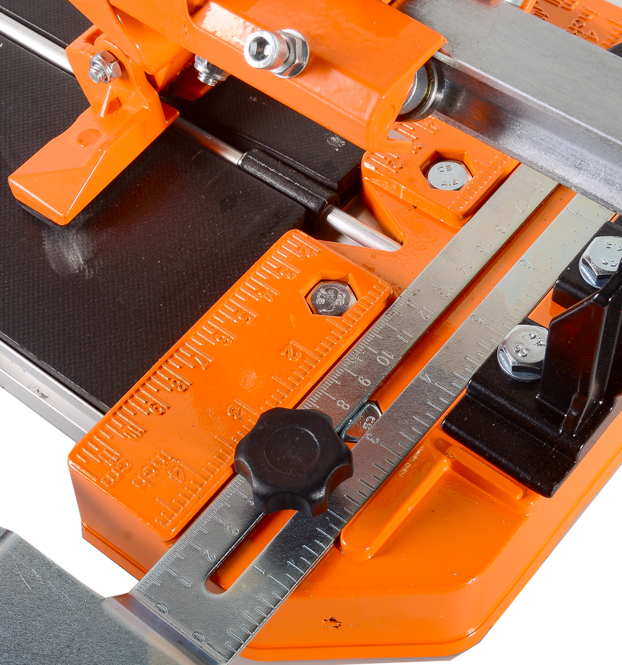 - Длинный рельс: длина рельса 600 мм обеспечивает возможность реза крупных форматов плитки без необходимости перестановки материала, что экономит время и повышает производительность.