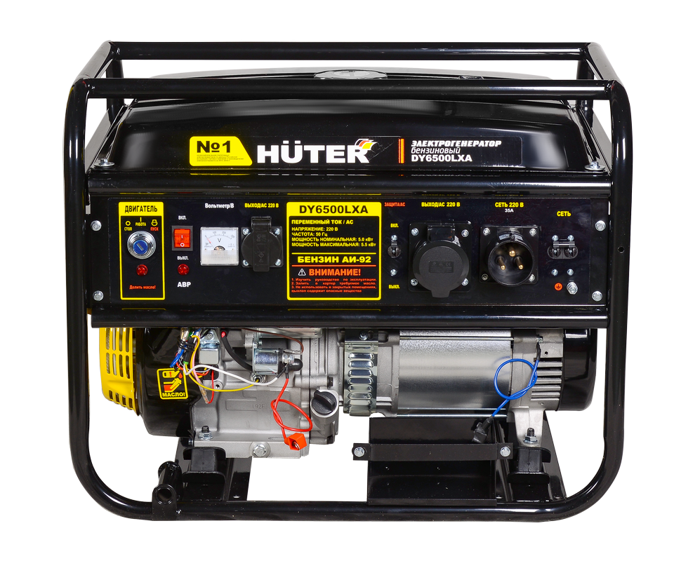 Вес генератора Huter DY6500LXA 80,7 кг и резиновые опоры снижают уровень вибрации и повышают его устойчивость на неровной поверхности. Металлическая обрешетка защищает автоматику от механических повреждений и обеспечивает длительный срок службы. Агрегат создан для питания электротехники, потребляющей до 5500 Вт, в частных домах, на участках и строительных площадках.