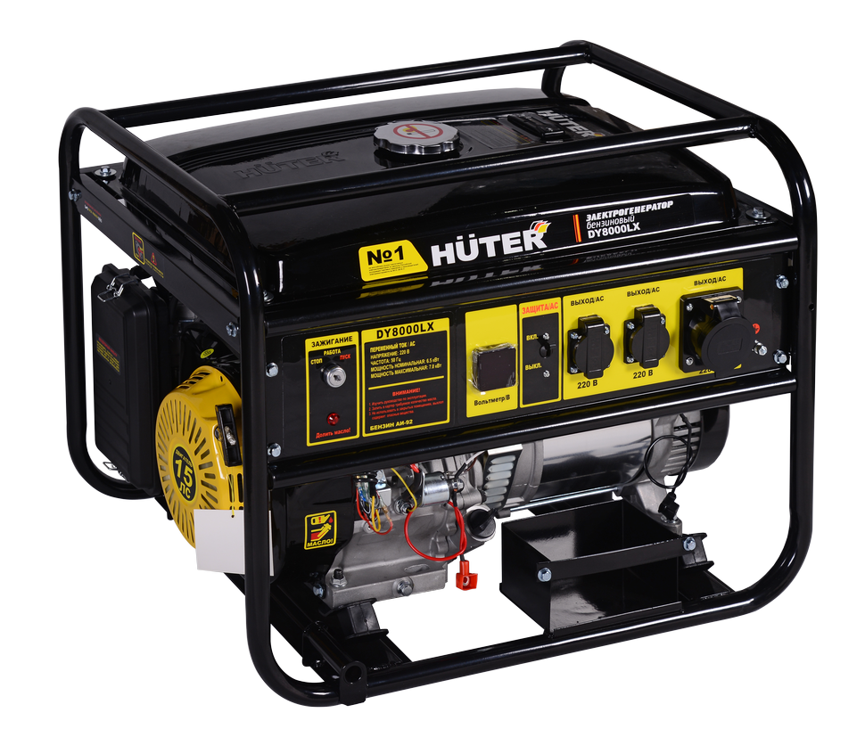 Электрогенератор HUTER DY8000LX имеет надёжную защиту от перегрузок и коротких замыканий. В его конструкции также реализована система блокировки пуска при недостаточном уровне масла. Стартер генератора ручной и электрический от АКБ, что позволяет быстро «стартовать» в любых погодных условиях. Имеется вольтметр для контроля величины напряжения. Для удобства транспортировки агрегат может комплектоваться колёсами (в базовую комплектацию не входят). В целом эта модель зарекомендовала себя как устойчиво работающая, с вместительным бензобаком – 25 л и с экономичным расходом топлива.
