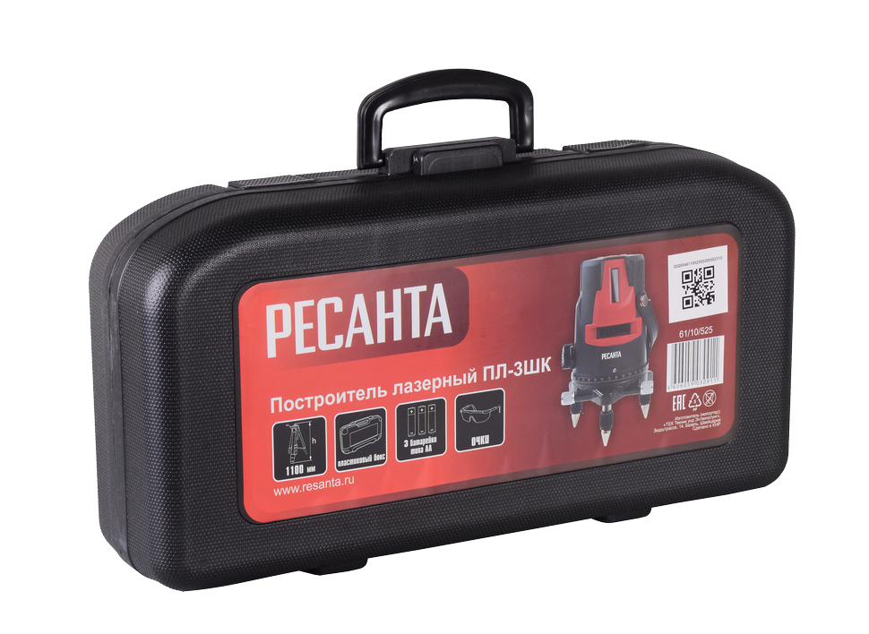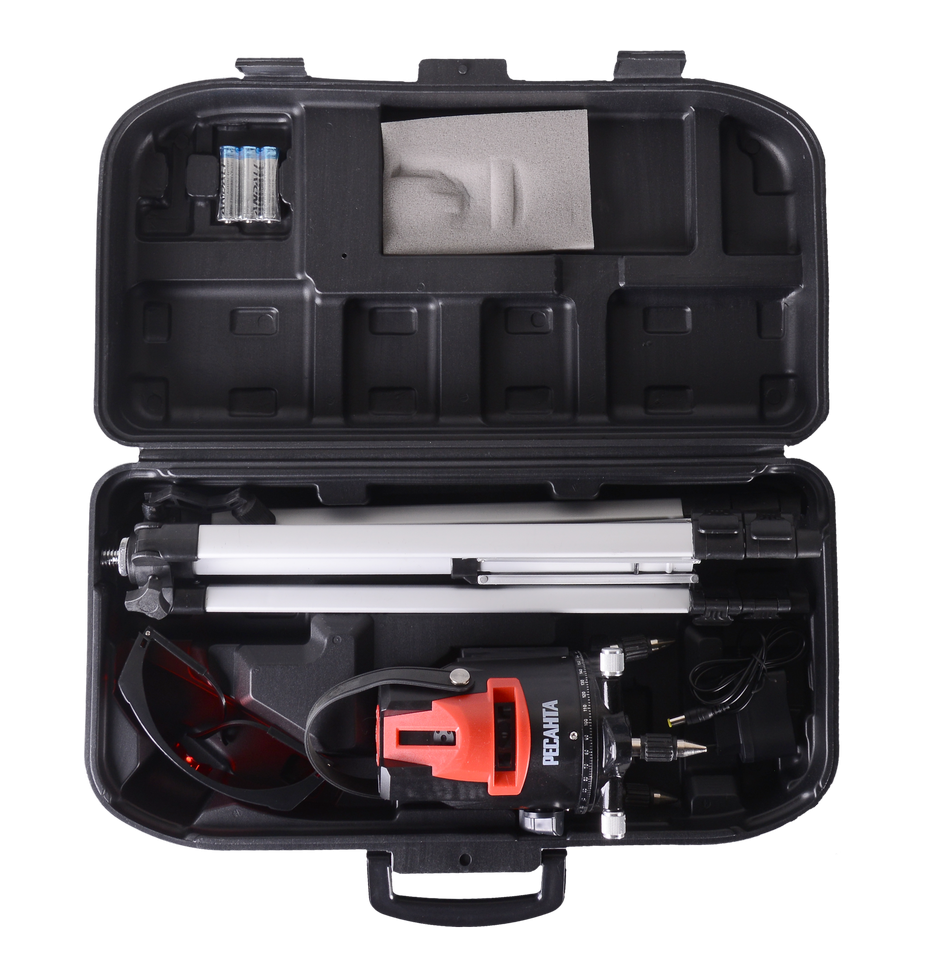 Лазерный построитель Ресанта ПЛ-3ШК работает от 3 батареек типа АА. Обеспечивает до 12 часов непрерывной работы. Световой индикатор позволяет оценить оставшееся время автономной работы. Пластиковый кейс обеспечивает безопасное хранение и транспортировку. Ножки-опоры позволяют устойчиво располагать уровень на ровной поверхности. В комплекте к построителю идут защитные очки и штатив. Для переноса по строительной площадке предусмотрена ручка на корпусе. Рабочий диапазон температур варьируется от -10° до +40° С.