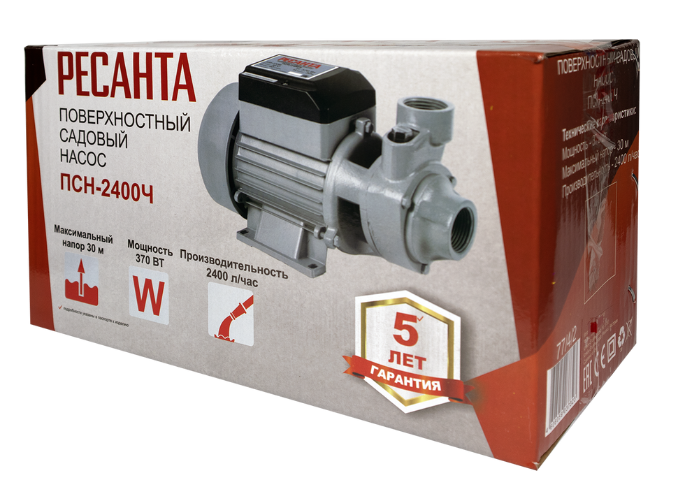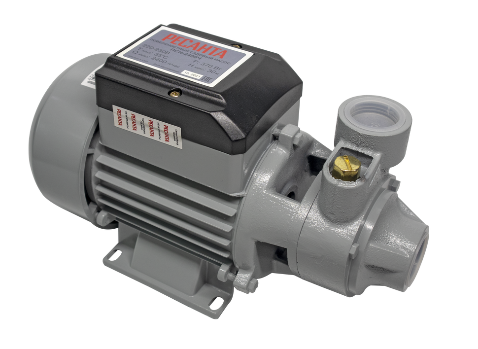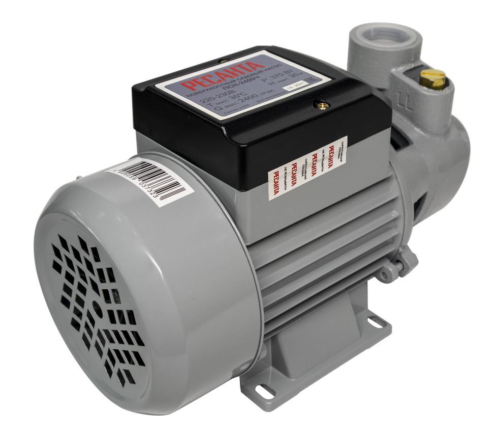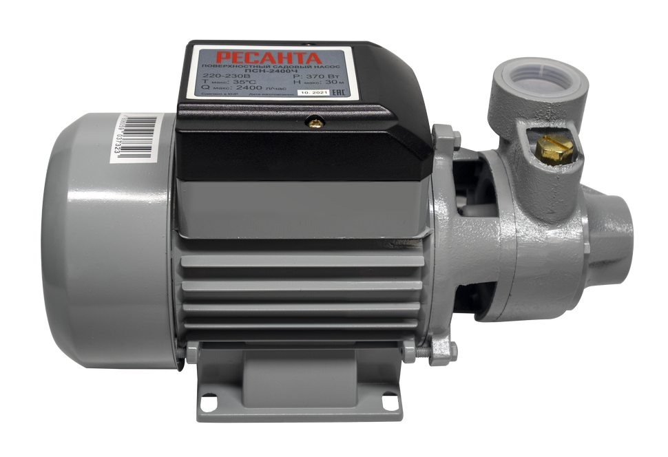 Поверхностный насос модели Ресанта ПСН-2400Ч – это простое, но эффективное решение для перекачивания воды на большие расстояния. Благодаря тому, что принцип его работы основан на всасывании, источник воды может располагаться на глубине до 9 м. И хотя мощность устройства составляет всего 370 Вт, легко может подавать воду до 30 м вверх. По этой причине хорошо подходит для частных коттеджей, дач и др. Также может применяться для полива, орошения полей и прочих целей. Максимальная подача составляет 40 л/мин.