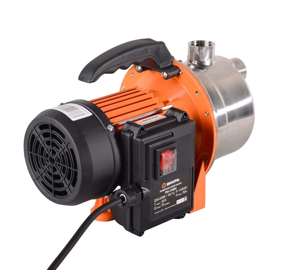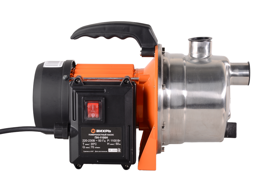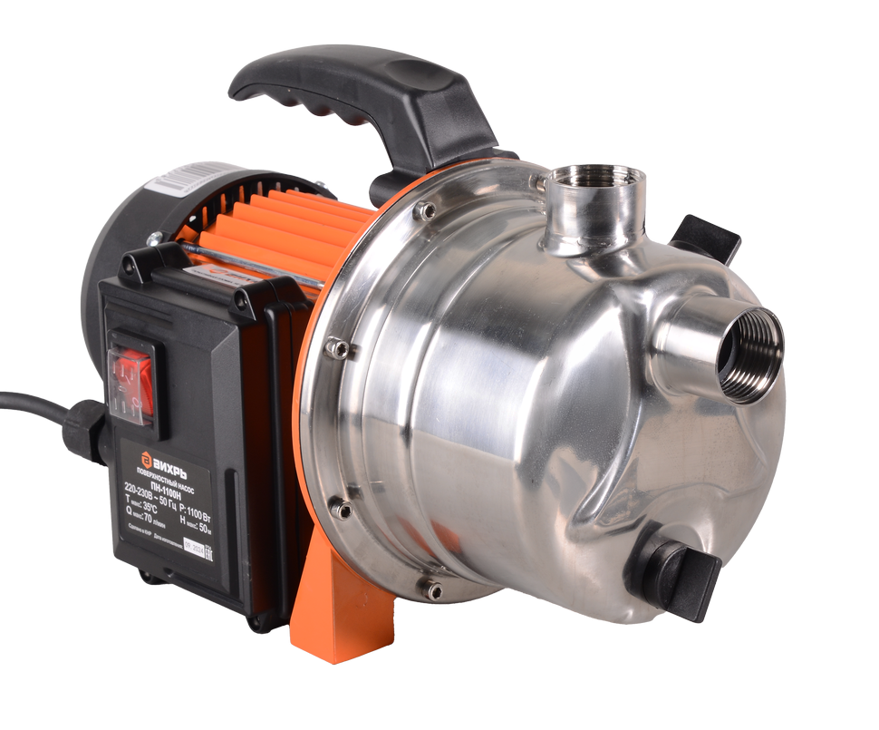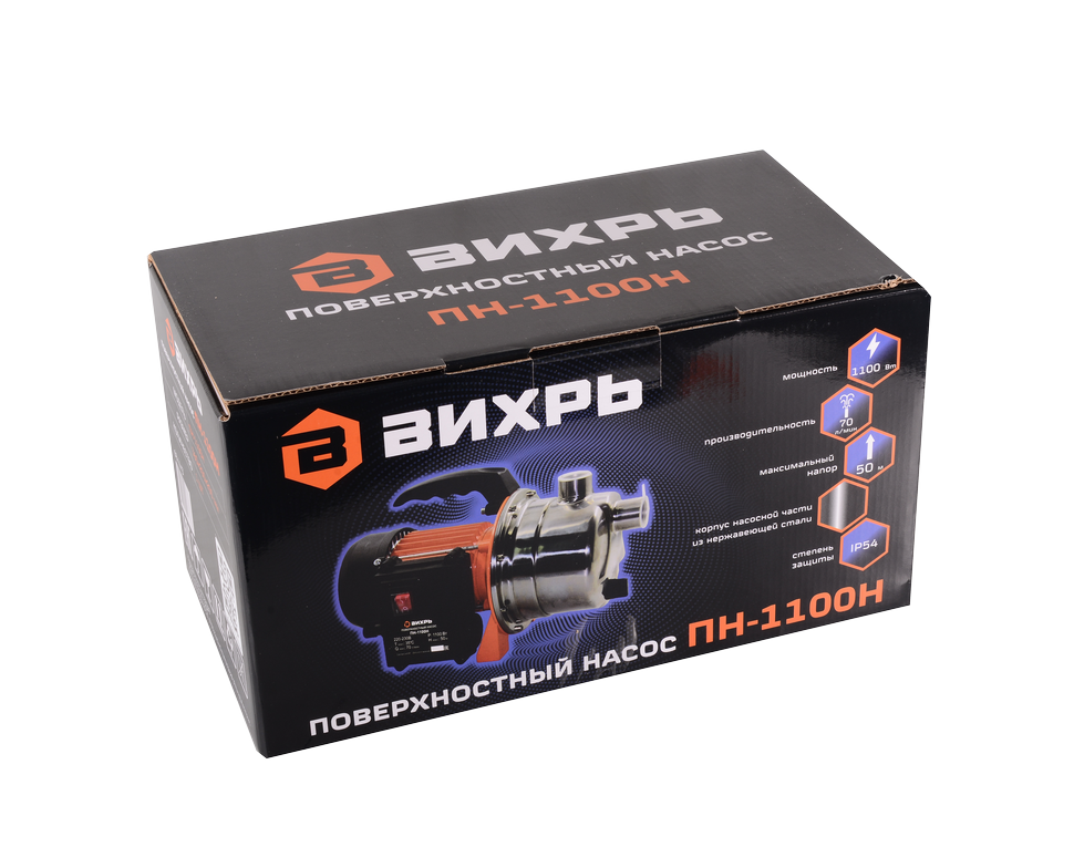 Поверхностный насос Вихрь ПН-1100Н центробежного типа подходит для перекачки чистой воды, в которой содержание механических частиц не превышает 150 г/м³. Электродвигатель мощностью 1100 Вт способен выкачивать воду с глубины до 9 метров и поднимать ее на высоту до 50 м. Его корпус выполнен из нержавеющей стали и устойчив к коррозии. Количество срабатываний двигателя в час ограничено 20 пусками. Это продлевает срок его службы. Насос оснащен эжектором. Производительность модели Вихрь ПН-1100Н составляет до 70 л/мин. График зависимости напора от высоты подачи воды указан в паспорте изделия.