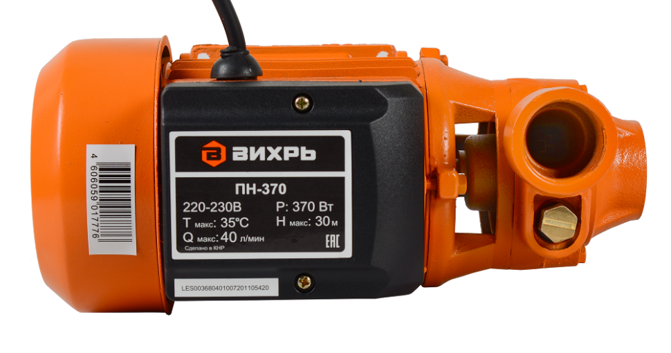 Модель поверхностного насоса вихревого типа Вихрь ПН-370 может использоваться как в системе автономного водоснабжения загородного дома, так и для подачи воды для систем орошения сада и огорода. Он состоит из электродвигателя и насосной части, объединённых в единую конструкцию и рассчитан на 20 включений в час. Мощность агрегата составляет 370 Вт. Объём перекачиваемой воды – до 40 л/мин. Напор – 30 м. Глубина всасывания – до 9 м.