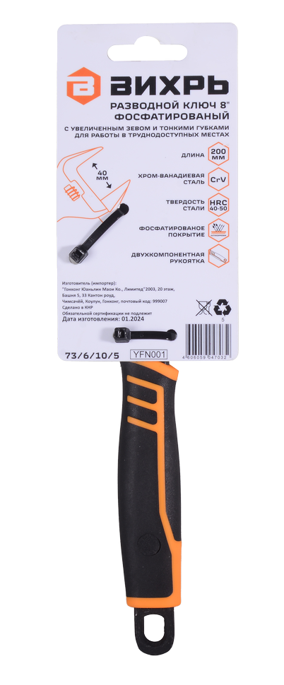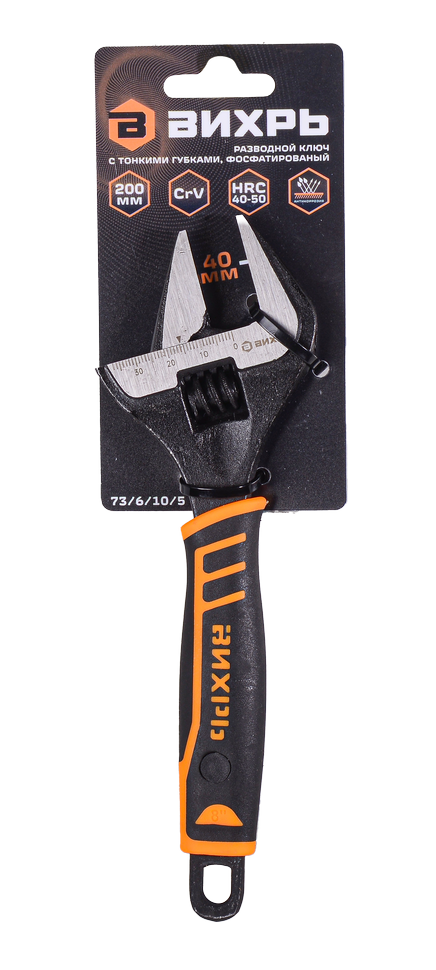 Разводной ключ 8" фосфатированный с увеличенным зевом и тонкими губками для работы в труднодоступных местах. Выполнен из хром-ванадиевой стали, твердостью 40-50 HRC с фосфатированным покрытием, двухкомпонентная рукоятка. Длина ключа составляет 200 мм, расстояние между губками 40 мм.