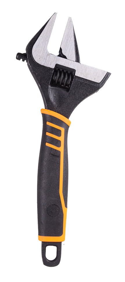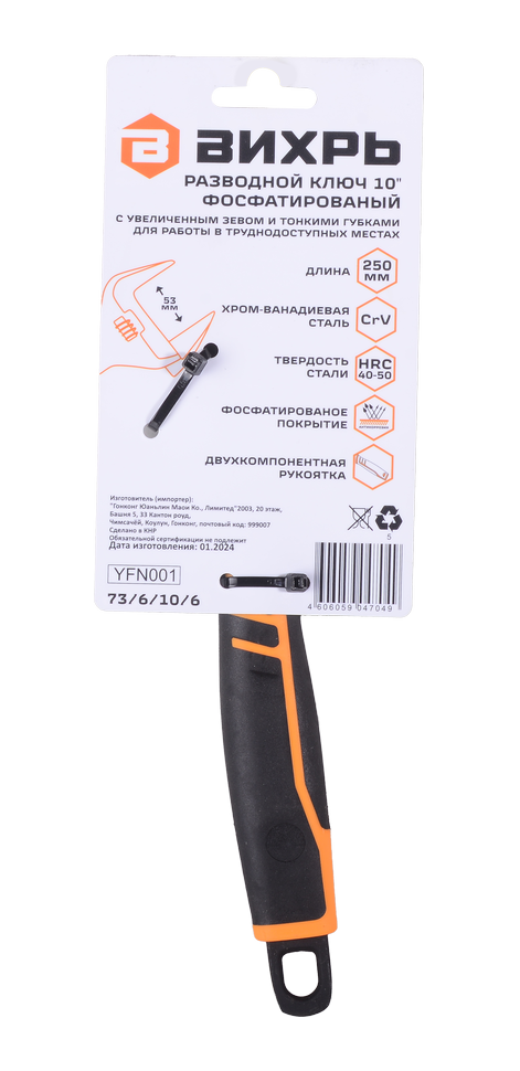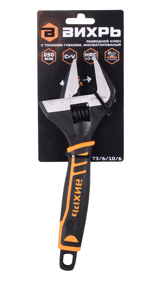 Разводной ключ 10" фосфатированный с увеличенным зевом и тонкими губками для работы в труднодоступных местах. Выполнен из хром-ванадиевой стали, твердостью 40-50 HRC с фосфатированным покрытием, двухкомпонентная рукоятка. Длина ключа составляет 250 мм, расстояние между губками 53 мм.