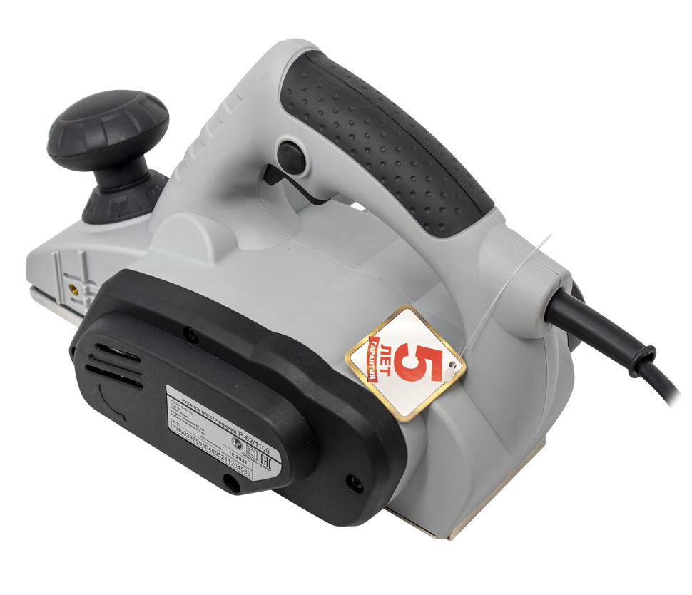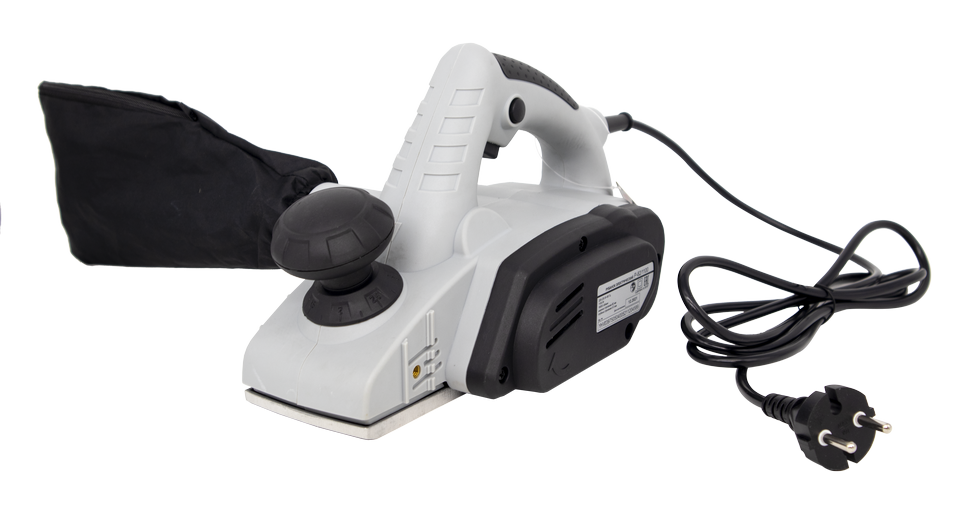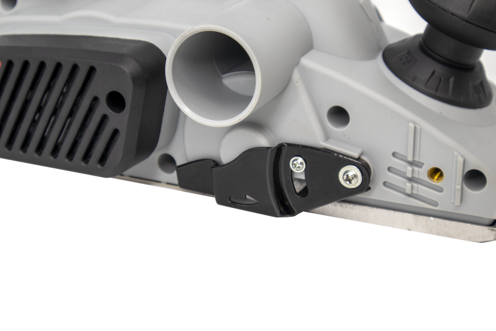Инструмент работает от сети, оснащен надежным электродвигателем мощностью 1100 Вт и числом оборотов 16000 в мин. Для обеспечения воздушного охлаждения мотора в корпусе предусмотрено наличие специальных вентиляционных отверстий. Электрорубанок легко справляется с любыми породами дерева и разными видами пиломатериала. Ширина строгания – 82 мм. В зависимости от стоящих задач глубину строгания можно менять в диапазоне от 0 до 3 мм. Для ее изменения достаточно повернуть шарообразную рукоятку, расположенную в передней части корпуса. Вокруг ручки имеется круговая шкала, которая позволяет точно выставить нужный параметр. Электрический рубанок имеет удобную эргономичную форму с широкой рукояткой и дополнительной ручкой. Кнопка включения расположена в удобном для нажатия месте. Устройство имеет блокировку на случай непреднамеренного запуска, а также фиксацию выключателя для удобства длительной работы с инструментом. Во время строгания стружка отводится в сторону, что обеспечивает чистоту и аккуратность выполнения работ. Ножи с двусторонней заточкой увеличивают длительность использования инструмента без необходимости делать перерыв на затачивание лезвий. Нож можно просто перевернуть другой стороной и продолжить работу. В случае затупления обоих лезвий нож следует заменить новым или произвести заточку.