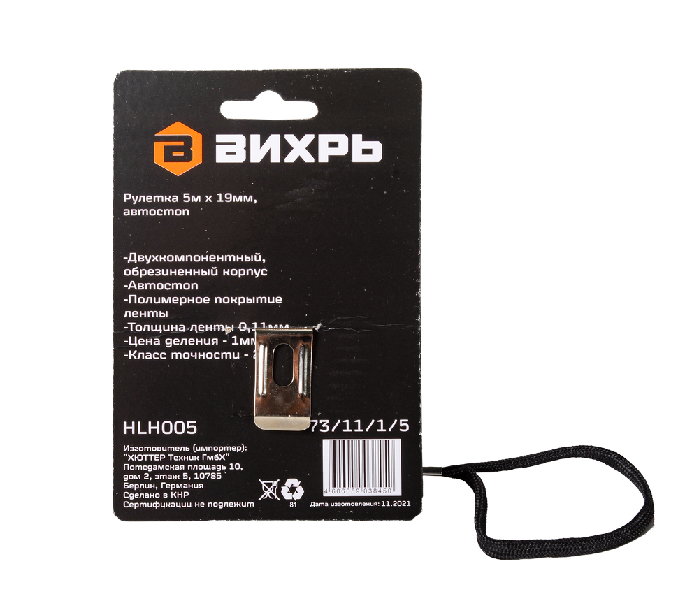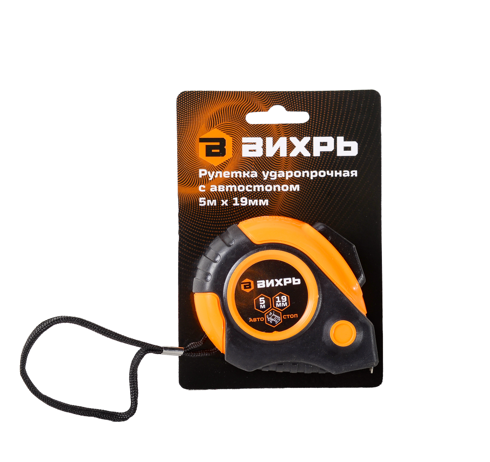 Рулетка Вихрь 5м х 19мм автостоп используется для измерения расстояний и размеров различных объектов. Она состоит из металлической ленты длиной 5 м и шириной 19 мм, которая закреплена внутри пластикового корпуса с кнопкой блокировки. Лента имеет полимерное покрытие, защищающее от коррозии. Цена деления – 1 мм.